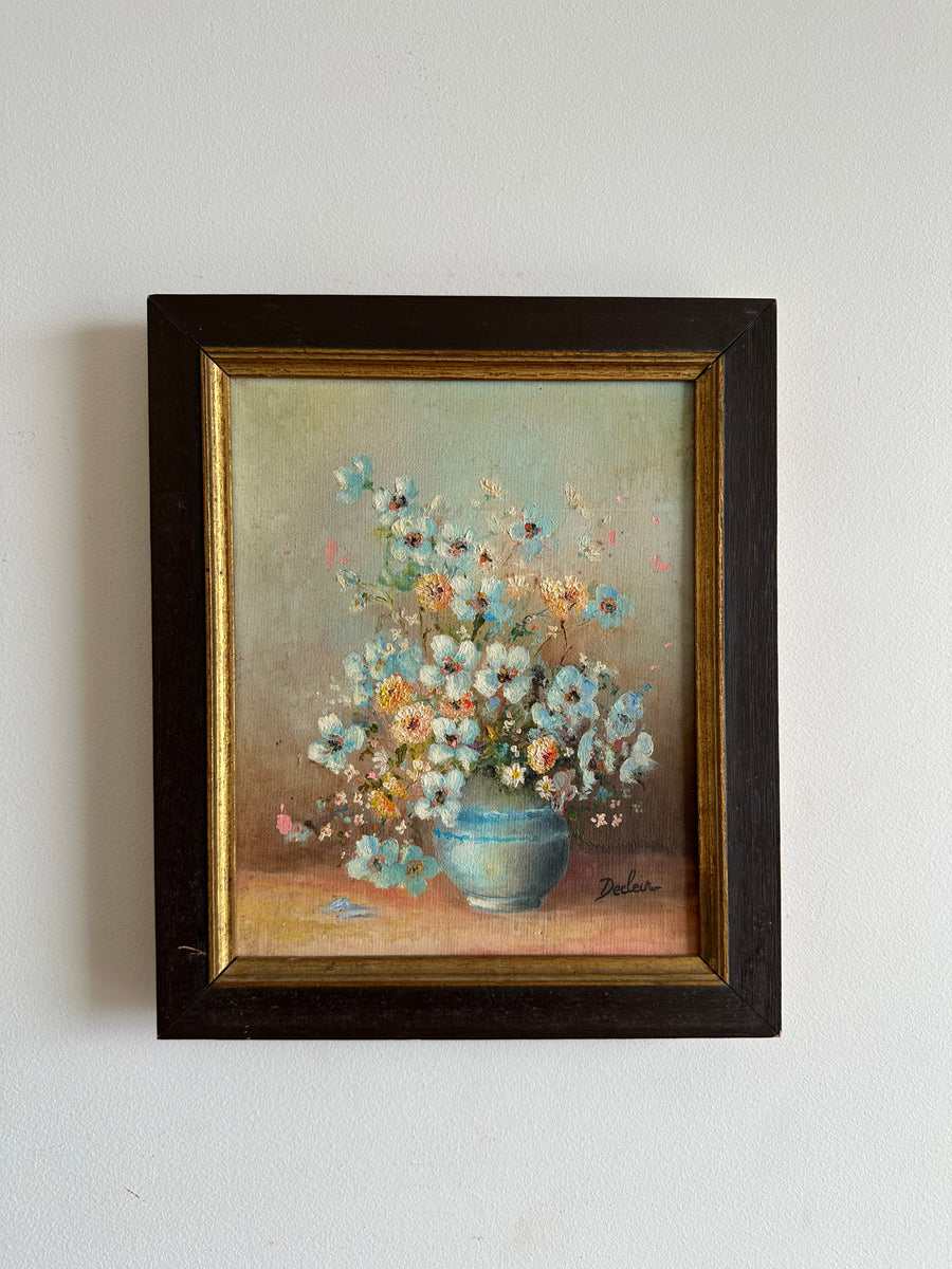 Ravissante peinture signée aux jolis tons bleutés. Il s'en dégage une belle douceur, rehaussée par son cadre en bois foncé. estimation années 40. A noter, de jolies traces du temps sur la toile et sur le cadre, visibles sur les photos.