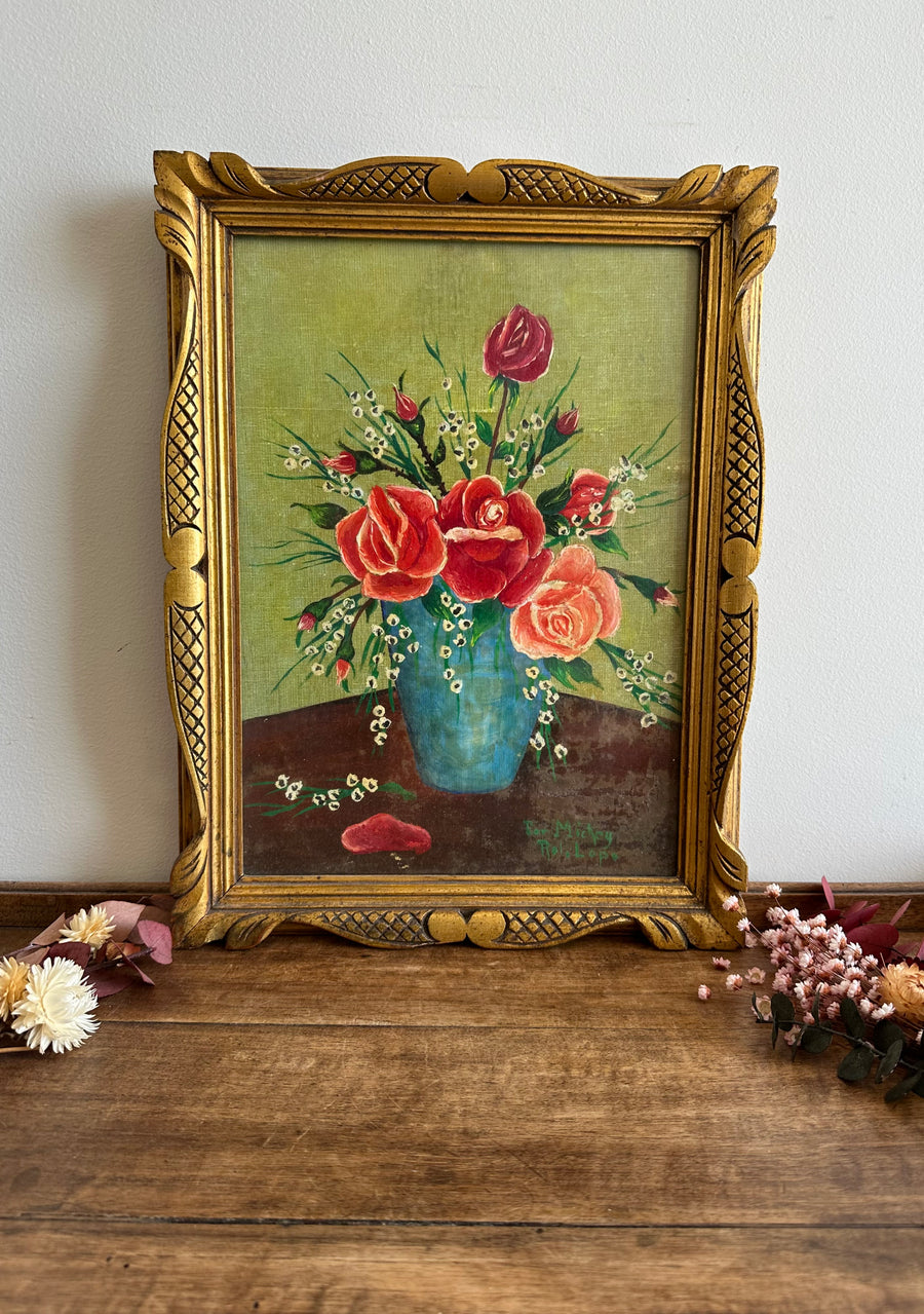 Coup de coeur pour cette jolie peinture sur toile signée représentant des roses rouges et roses dans un vase bleu. On aime son fond vert qui lui donne un petit coté naif. Joli cadre en bois et stuc doré. Estimation années 40-50. A noter, des traces du temps en bas à droite où l'huile s'est un peu craquelée.