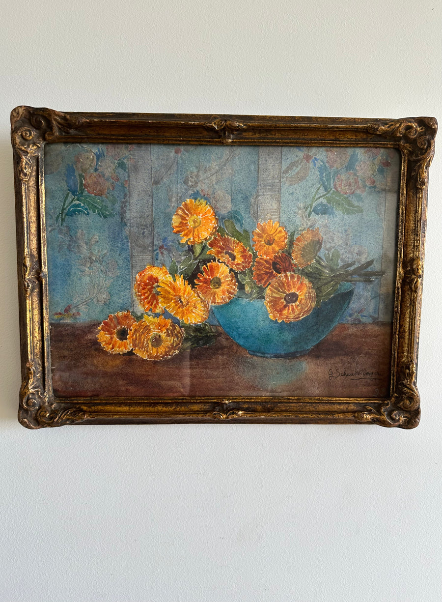 Charmante peinture signée, composition florale aux jolis tons orangés et bleus. Beau cadre florentin en bois mordoré. Estimation 1900.