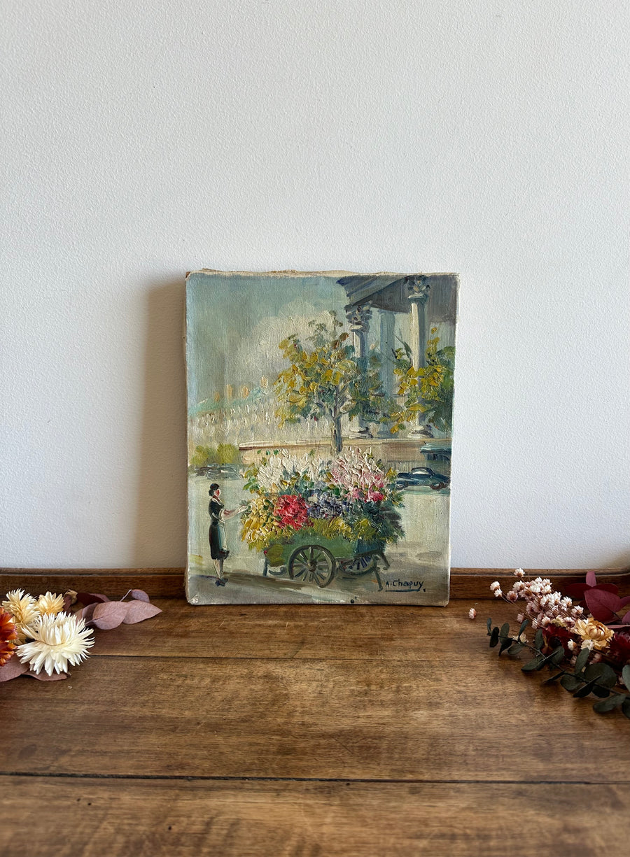Coup de coeur pour ce ravissant tableau signé. Peinture sur toile signée A.Chapuy d'après le tableau "Place de la Madeleine" d'André Franchet. On aime la délicatesse du dessin et la gaieté des couleurs. Estimation années 1920.