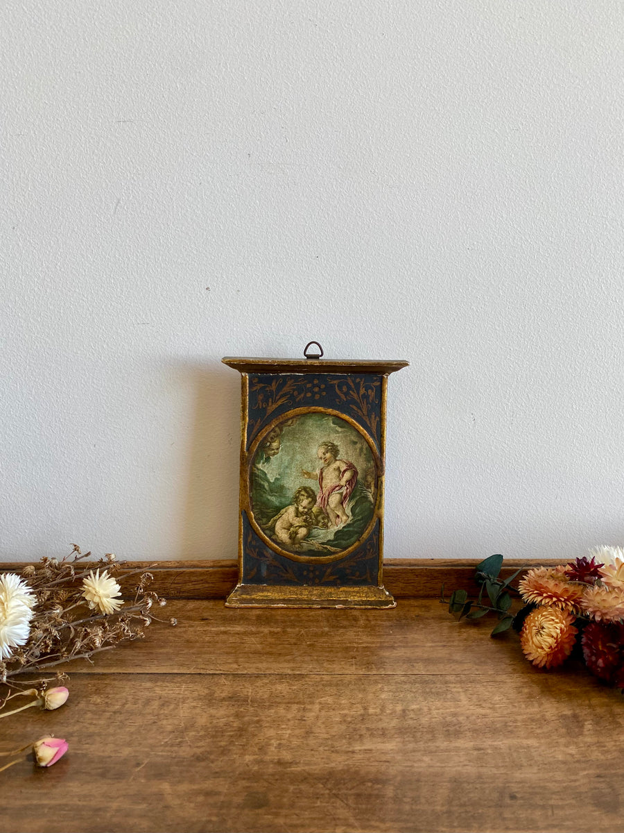 Jolie illustration chérubins incrustée sur un cadre en bois peint à la main. Très ancien, dans son jus mais tellement beau ! (en toute objectivité)