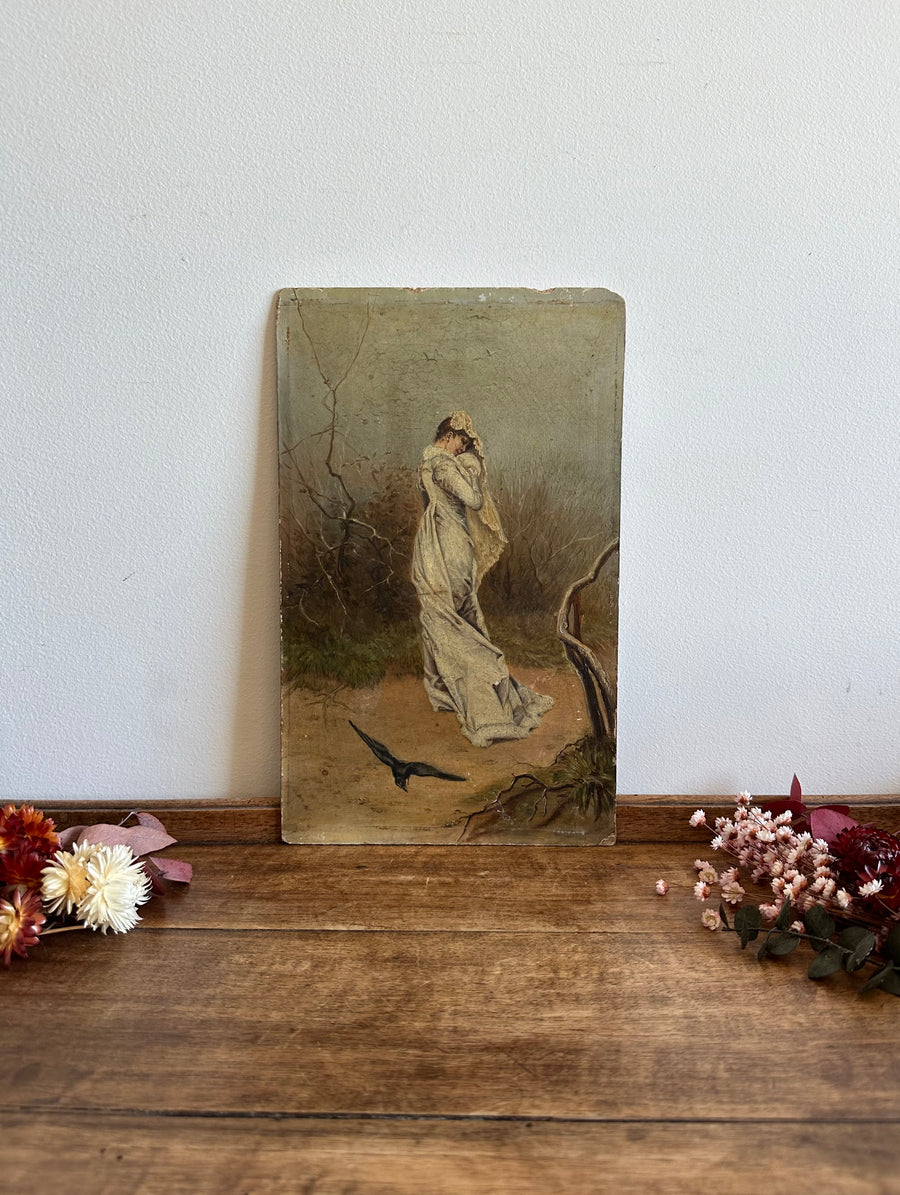 Coup de coeur pour cette superbe peinture à l'huile sur panneau du XIX ème. Représentation d'une jeune femme en robe blanche dans une foret. Allegorie du commencement de l'hiver.