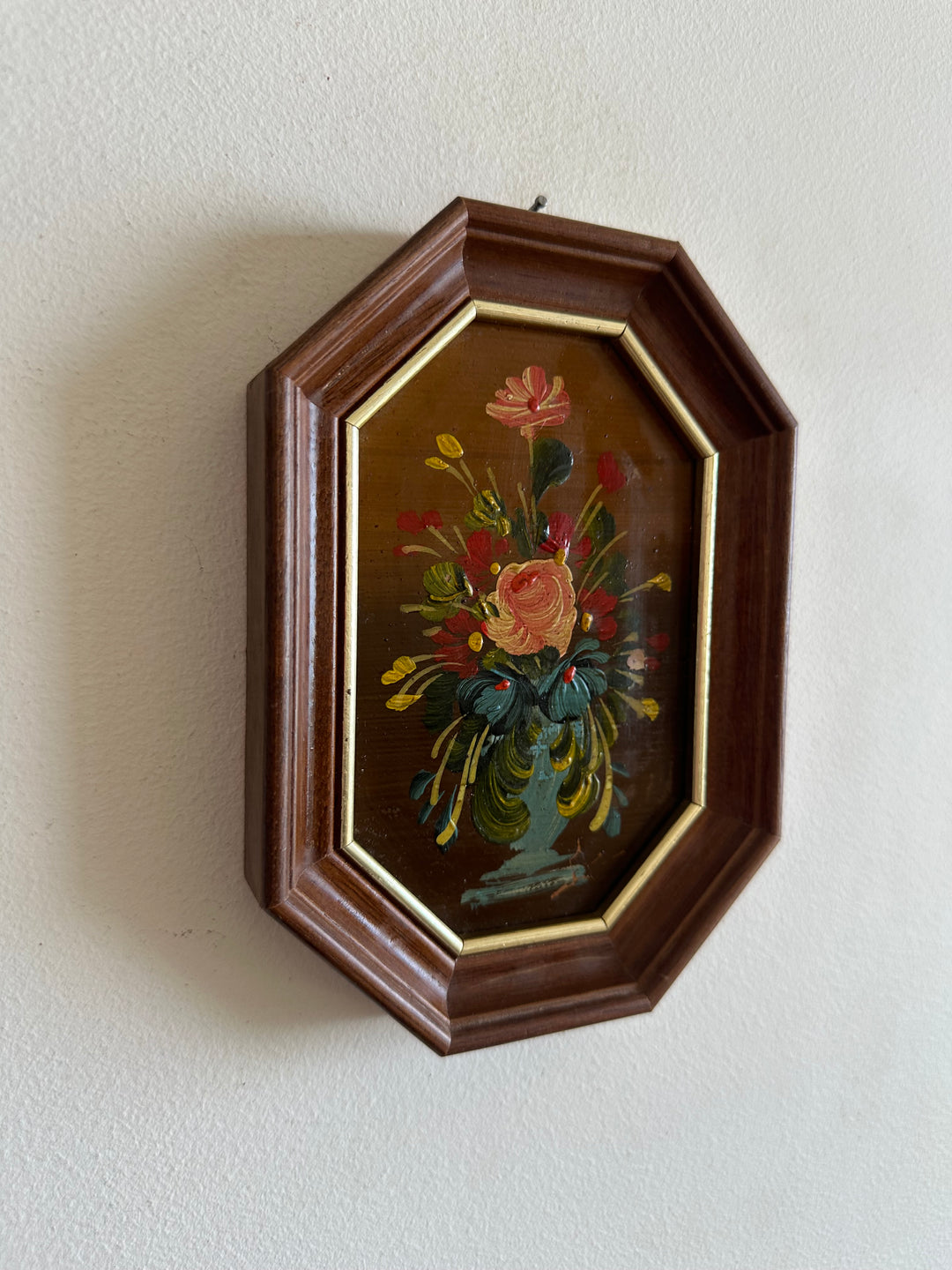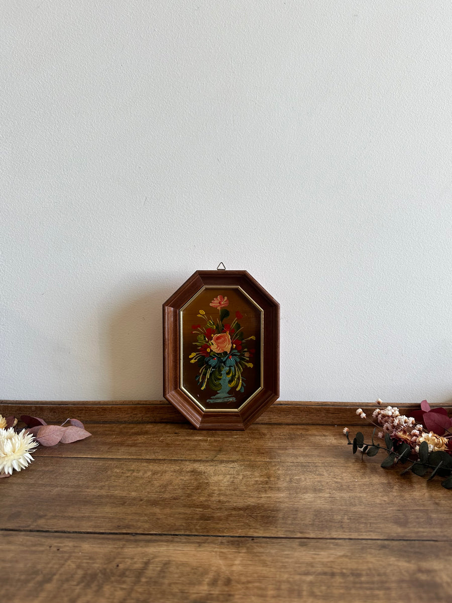 Jolie petite peinture florale sur plaque de cuivre signée. Cadre en bois octogonale. Estimation années 50.