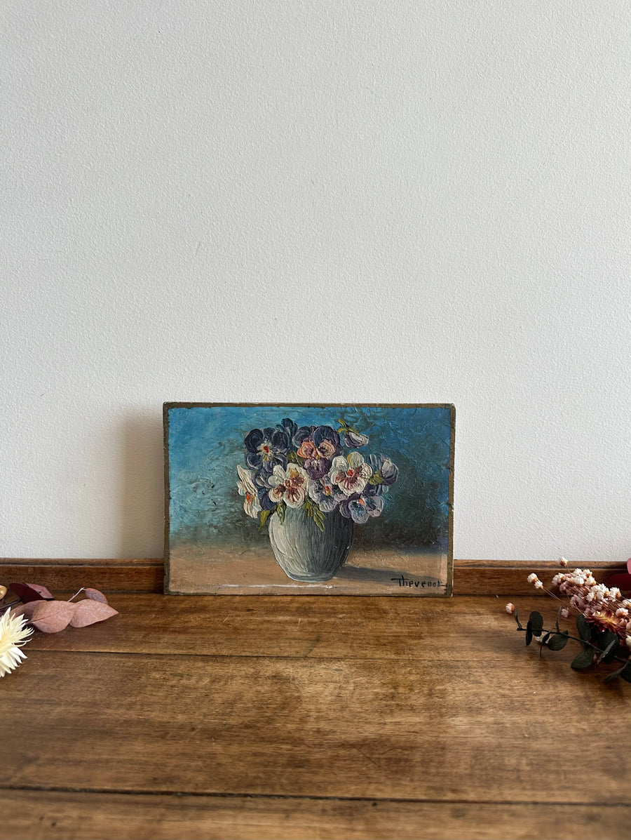 Coup de coeur pour cette ravissante petite peinture sur planche signée. Estimation début XXème. On aime la douceur des tons bleus choisis par l'artiste et la délicatesse des jolis pétales. Objet imparfait et charmant.