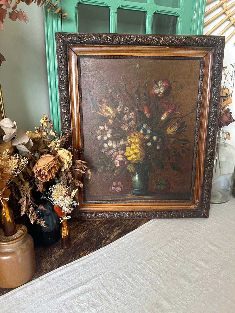 Peinture sur toile bouquet de fleurs encadrée signée années 1900 taille XL