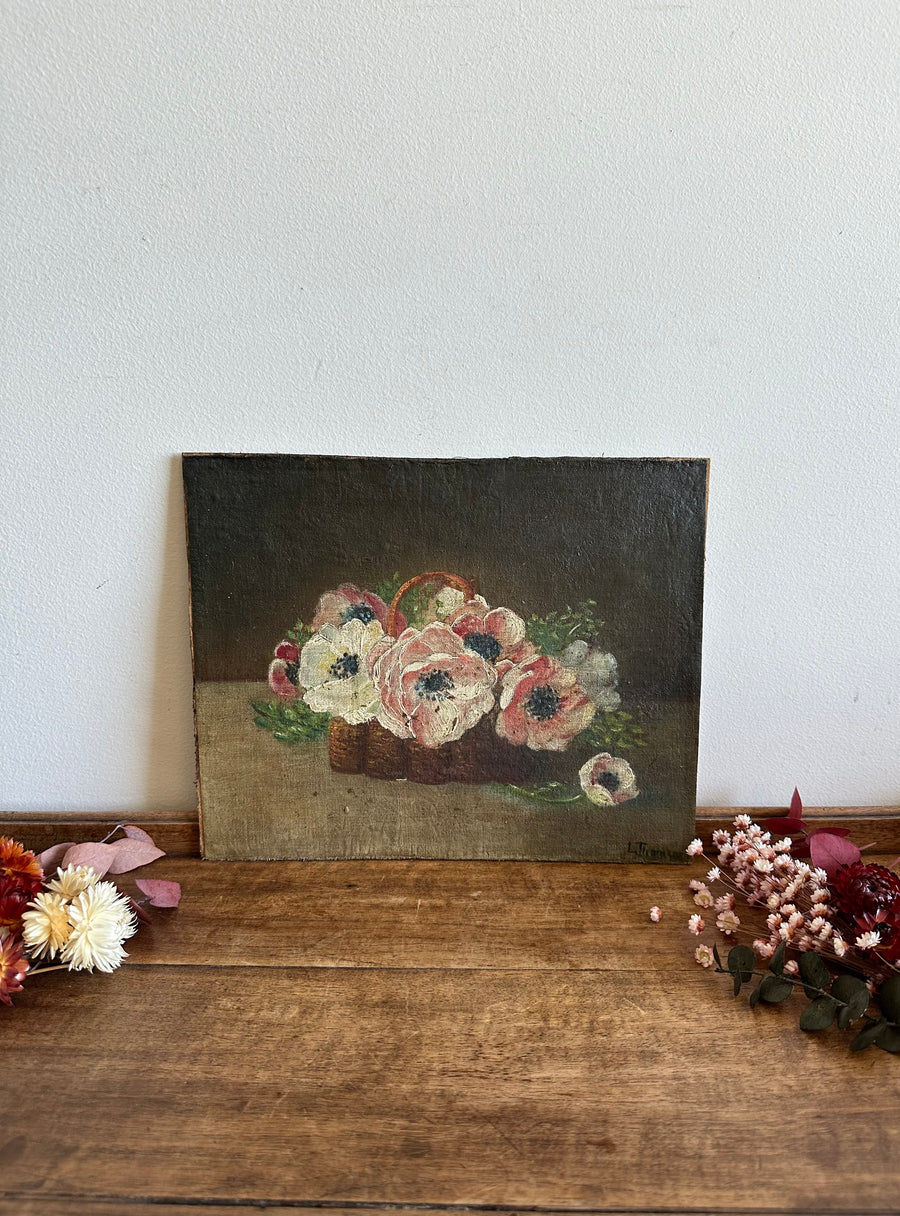 Douce peinture sur toile signée, représentant un bouquet de fleurs aux tons roses et blancs, dans leur panier en osier. Toile posée sur bois. On aime l'effet clair obscur ses jolies couleurs. Estimation années 40