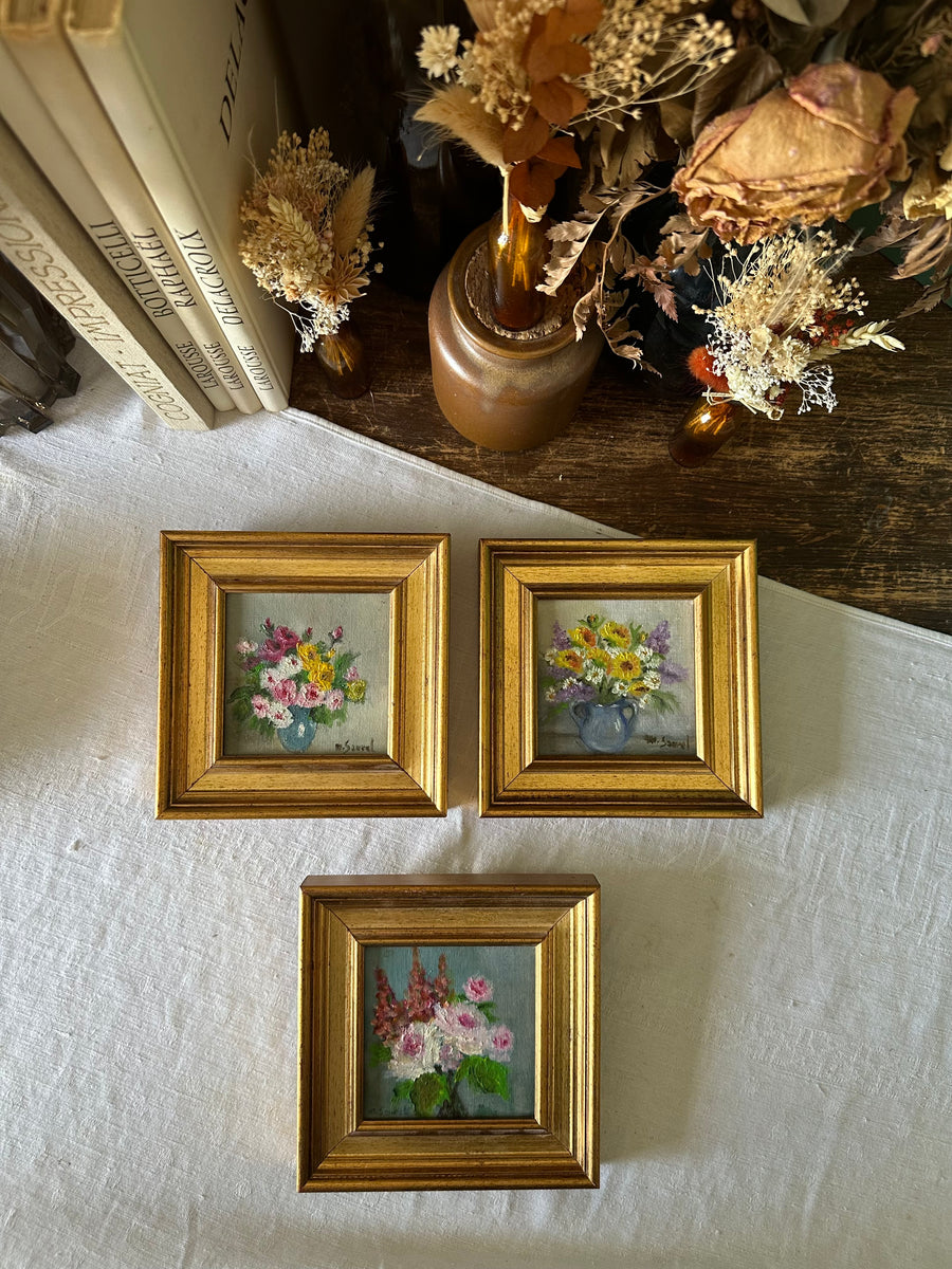 Ravissant trio de petites peintures florales signées. Véritables touches de gaieté sur un doux fond gris. Estimation années 90. Vendues séparément.