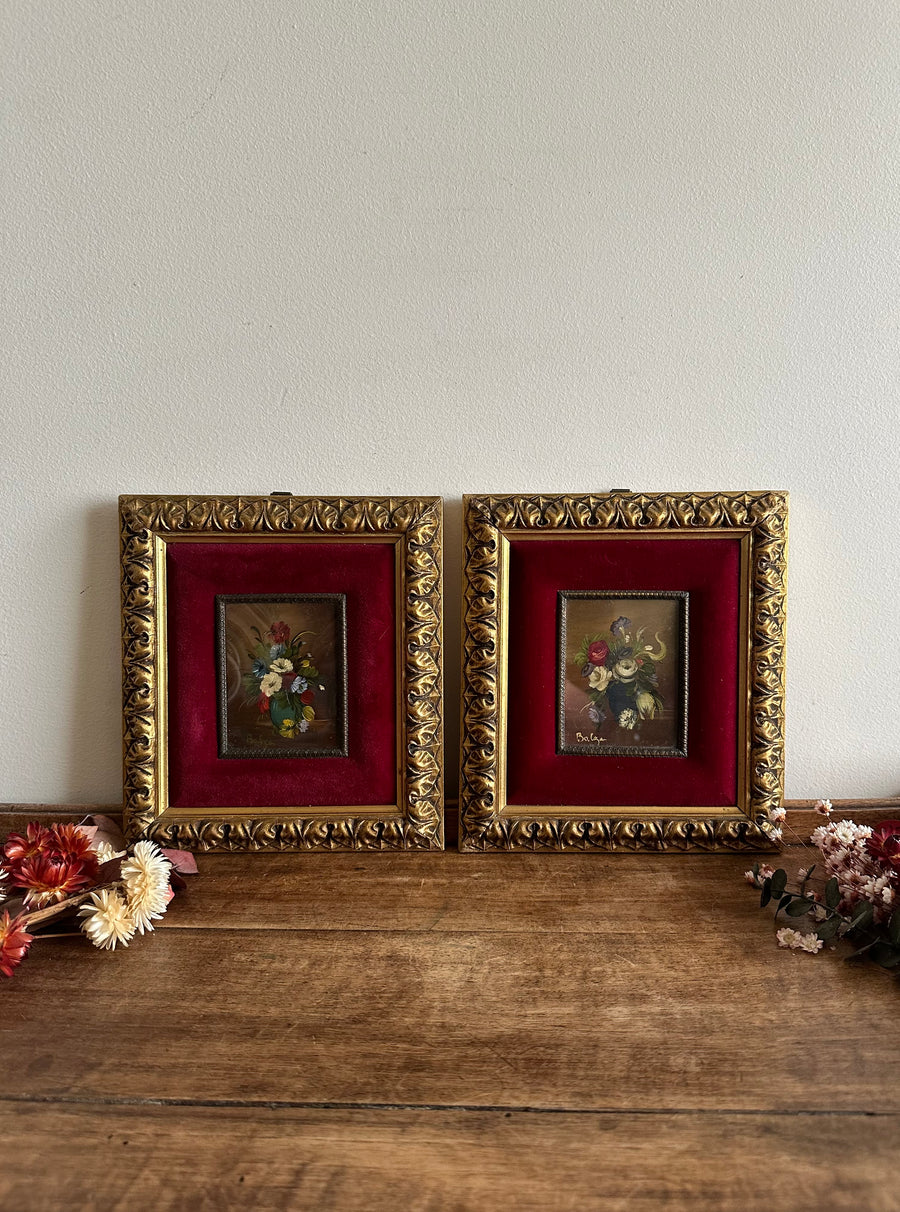 Peintures florales sur cuivre bordure velours rouge cadre carré