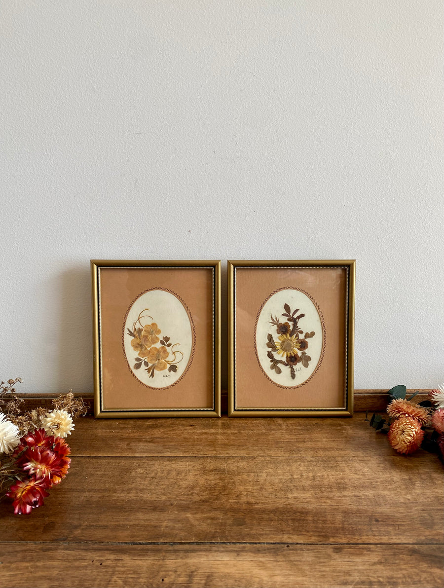 Joli duo de deux petits cadres renfermant de délicates fleurs séchées sur fond caramel. Village Green Country Crafts Ltd