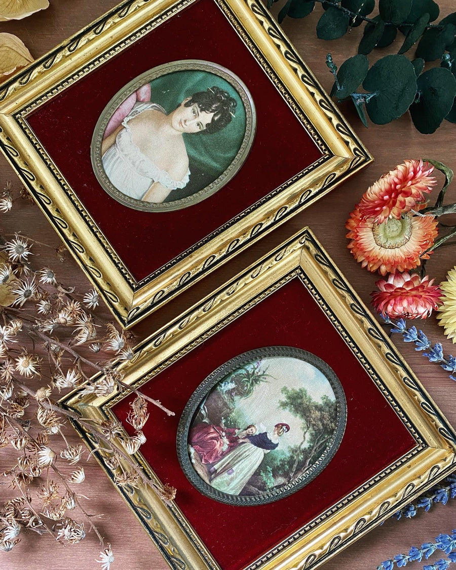 Deux petits cadres vintage avec jolis portraits et fond en velours grenat.