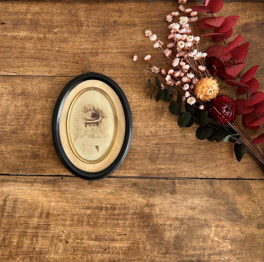 Charmante photographie datant du 19 ème dans son cadre en bois et laiton. A noter une des accroches manque au dos mais le tout reste très stable. Lors de son nettoyage nous avons ouvert les accroches et remarqué les fragmants d'une lettre ecrite à la main, au dos de la photo. Il s'agit d'une lettre d'une jeune femme à sa mère lui annonçant son arrivée prochaine.