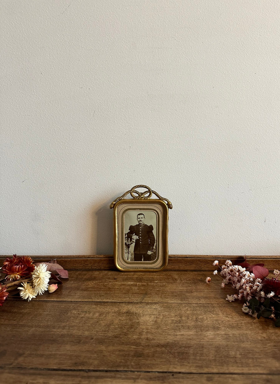 Charmant portrait du 19ème dans son joli cadre en métal doré décoré d'un noeud corde. Photographie procédé platinotypie breveté en 1873. Objet très ancien !