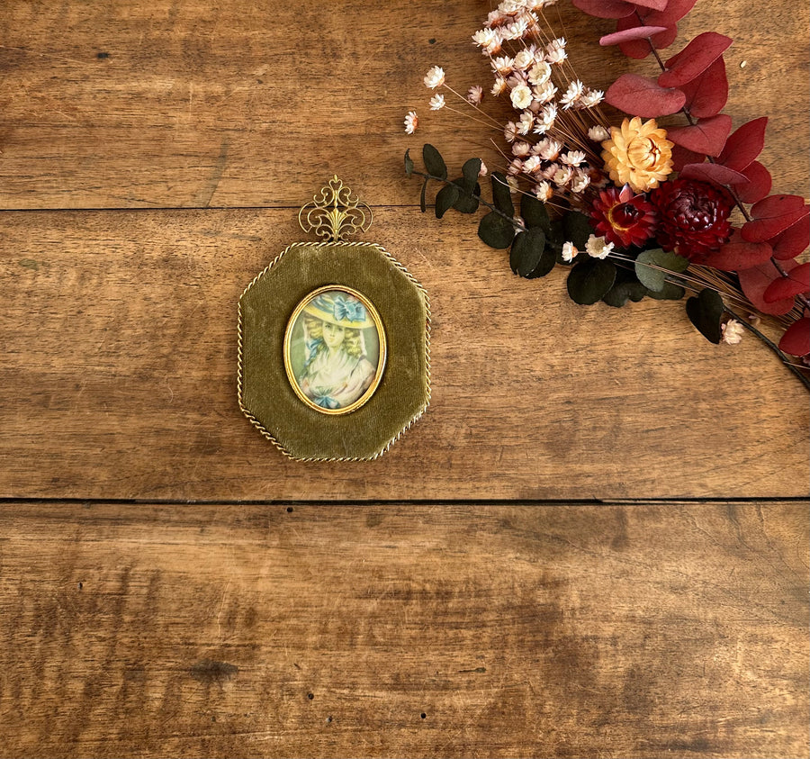 Portrait jeune femme dans médaillon octogonal en velours vert