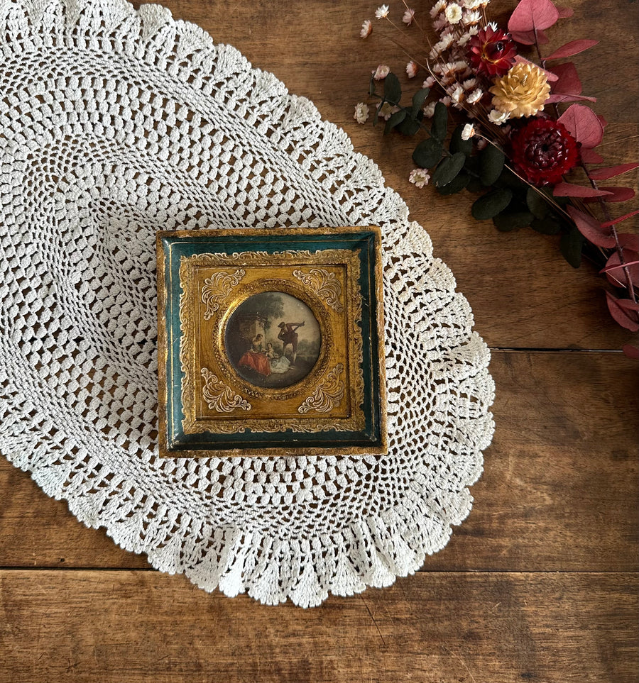 Joli petit cadre style florentin aux tons bleu et or. Une belle patine. Représentation d'une scène d'époque, sérénade de jeunes gens.