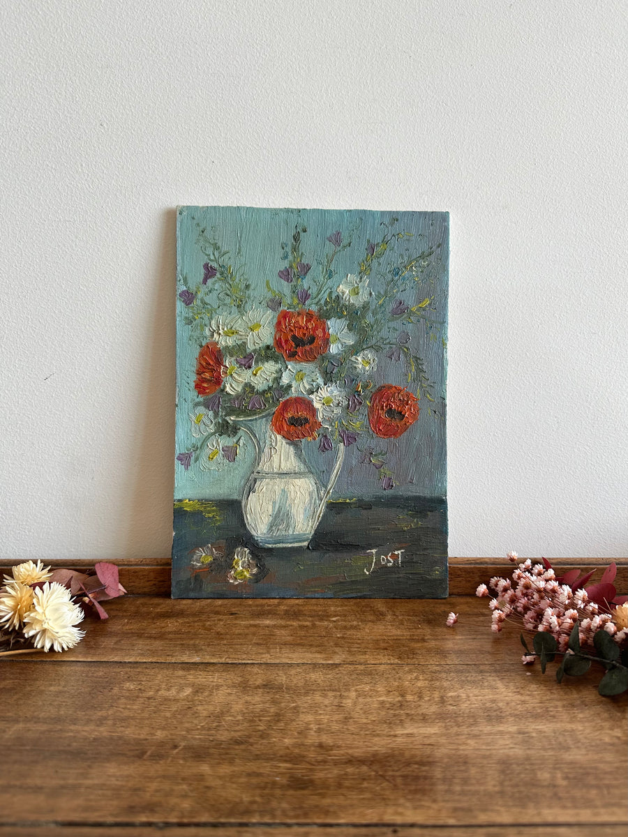 Adorable petite peinture représentant un joli bouquet de fleurs dans un pichet.