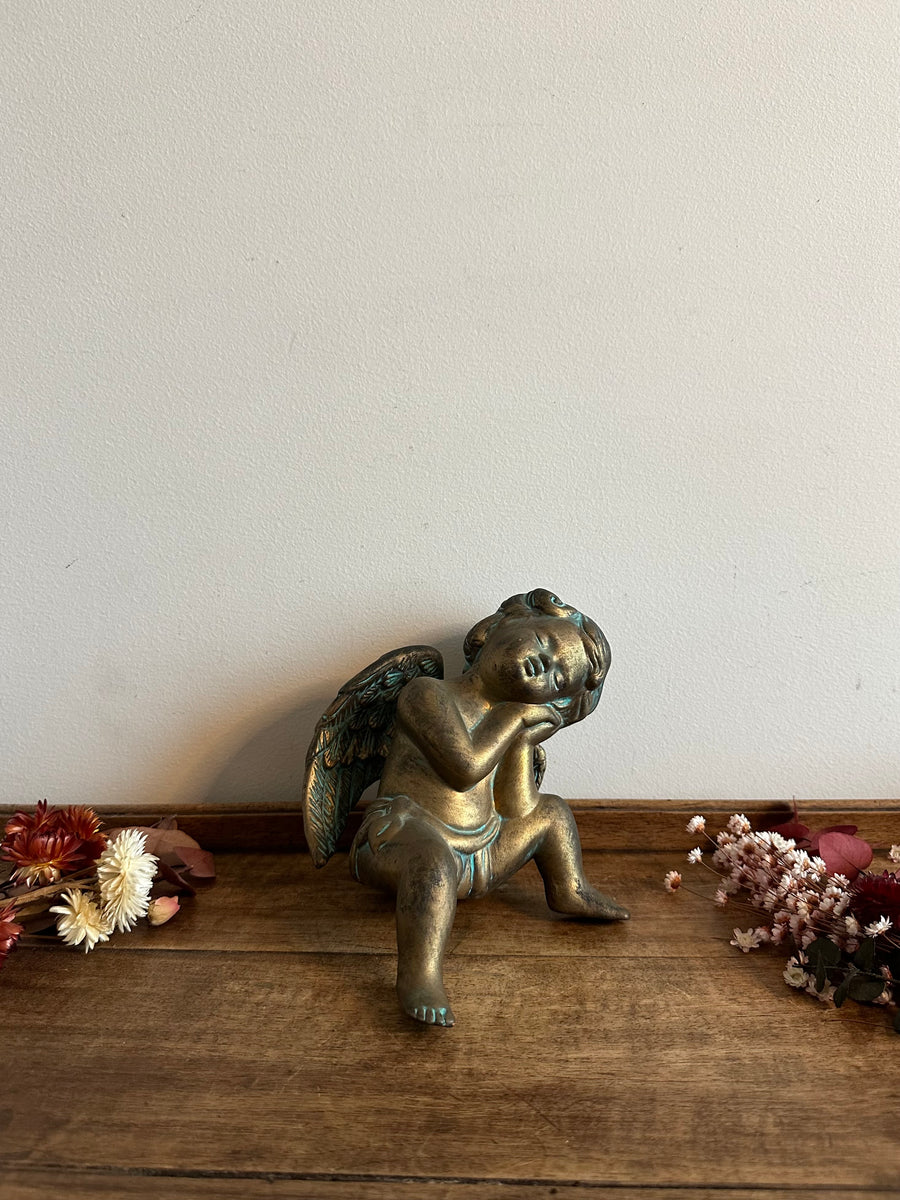Adorable petit angelot assoupi, en plâtre peint façon bronze. Estimation années 70-80.