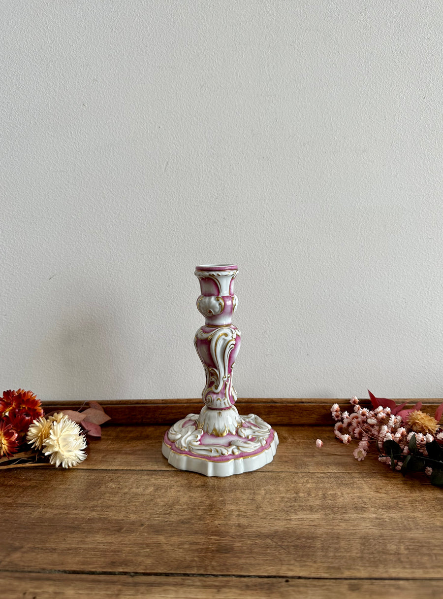 Bougeoir en porcelaine, minutieusement peint à la main. Très certainement un ancien socle de lampe de chevet, plus tard transformé en bougeoir. Estimation années 60.