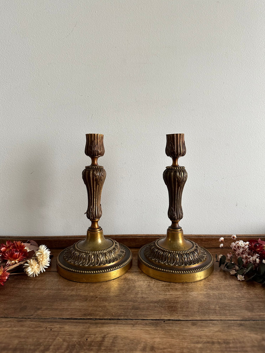 Joli duo de bougeoirs en bronze. On aime leur base large et travaillée. Estimation années 60.