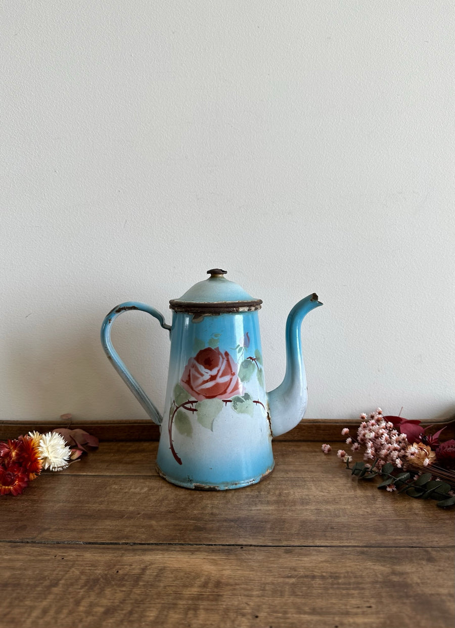 Belle cafetière en tôle émaillée dans son jus comme on les aime ! Jolie déco rétro à détourner en vase si on le souhaite. Estimation Années 40-50.