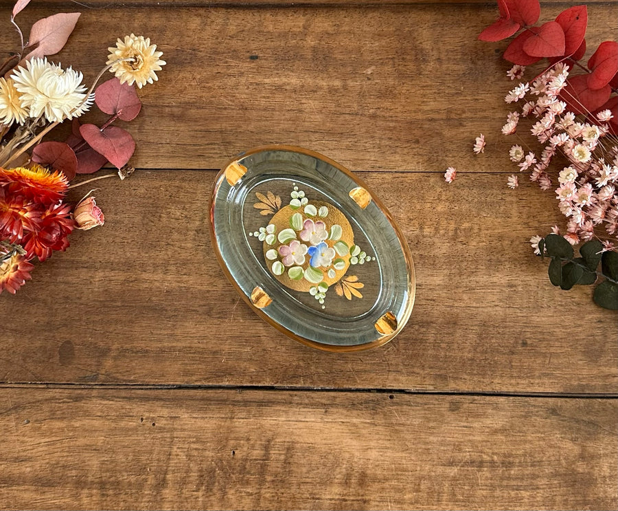 Charmant petit cendrier en verre moulé aux touches dorées, décoré de fleurs en relief peint à la main dans l'esprit murano.