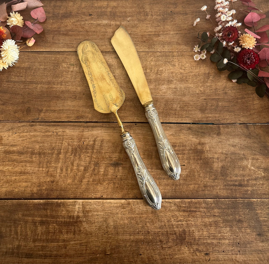 Charmant duo de couverts de service en laiton et métal argenté. Estimation années 50.