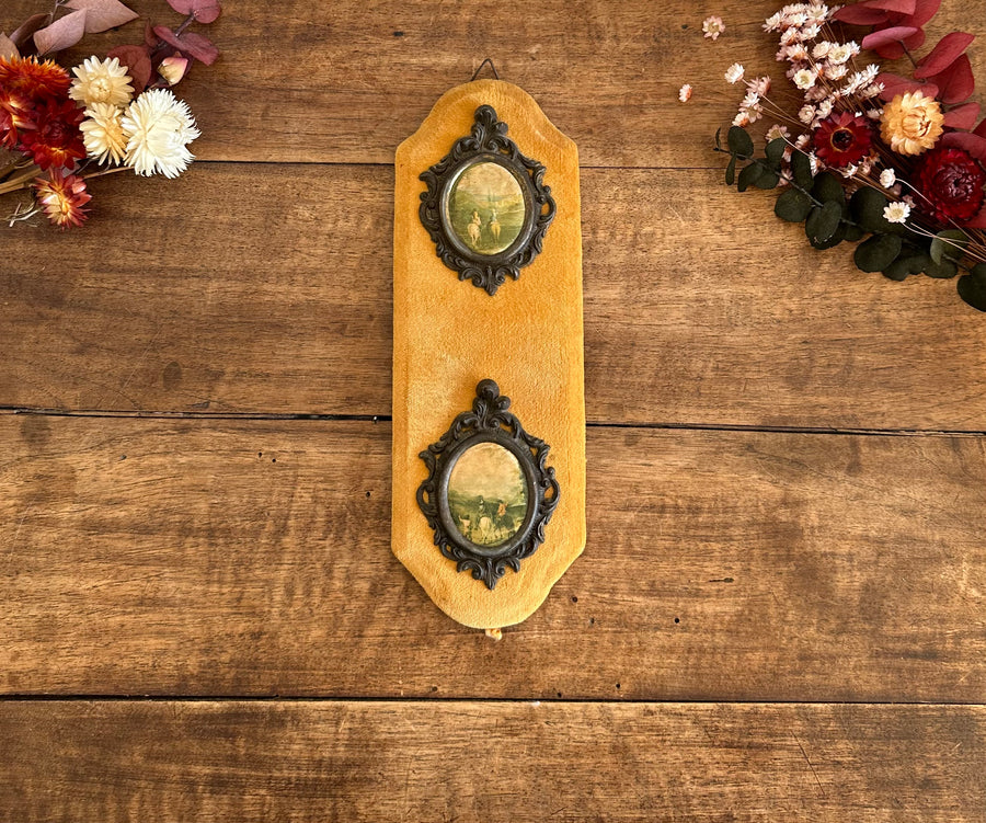 Diptyque de petits médaillons sur velours couleur moutarde