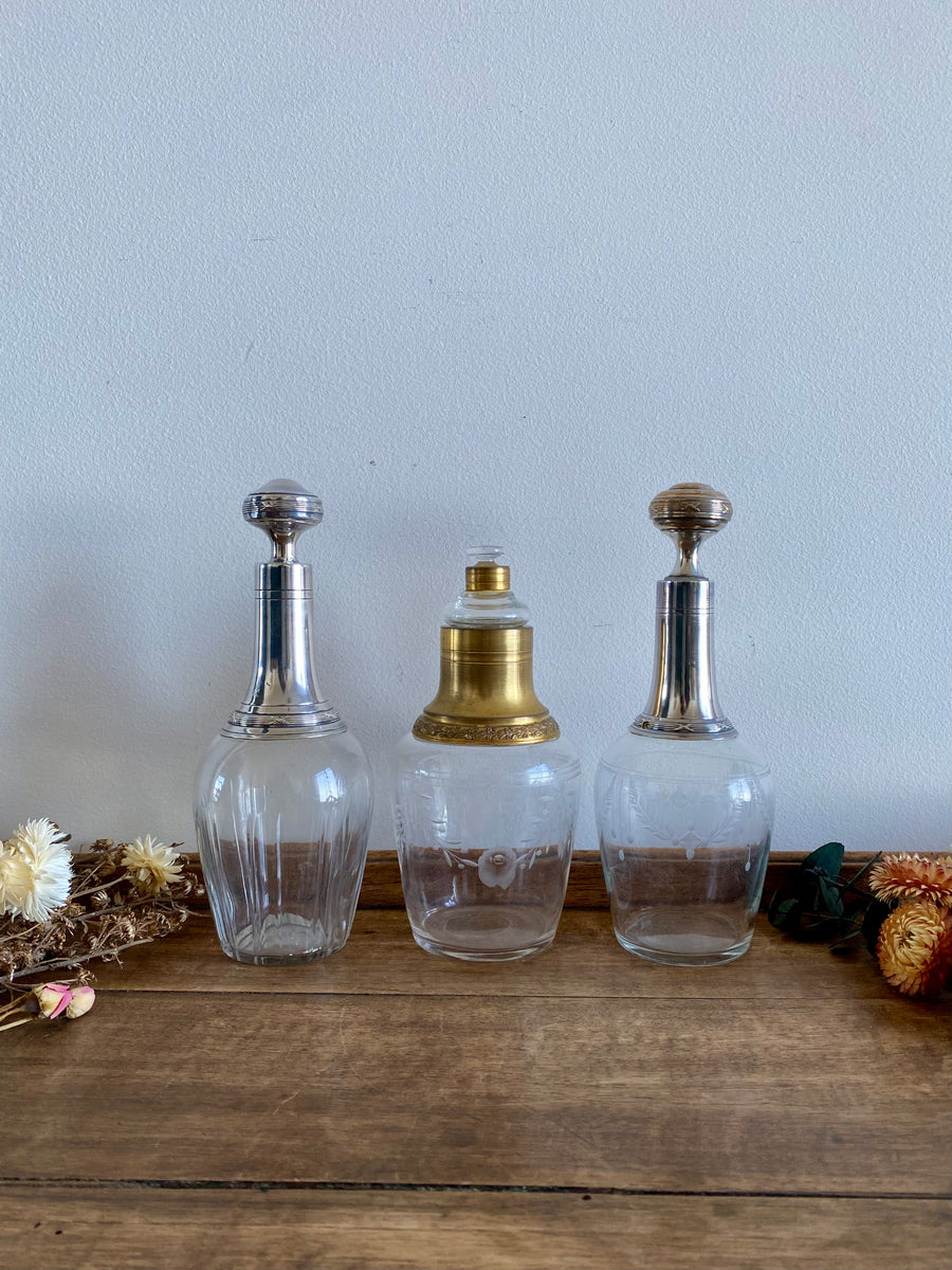 Ensemble de flacons anciens en verre travaillé, munis de leurs petits bouchons intérieurs en verre dépoli et leurs bouchons en métal argenté.