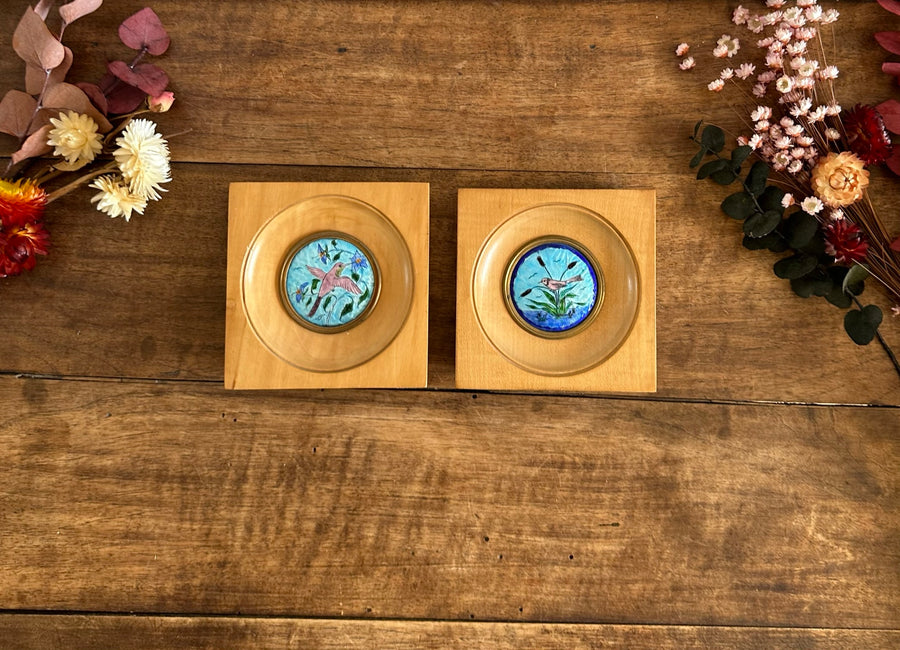 Lot de deux adorables miniatures émaillées dans leurs petits cadres carrés en bois clair .