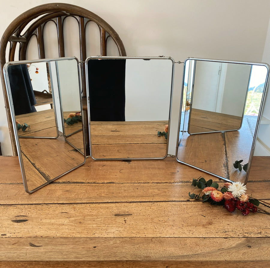 Élégant miroir de barbier triptyque en métal datant des années 50. Élément déco vintage parfait