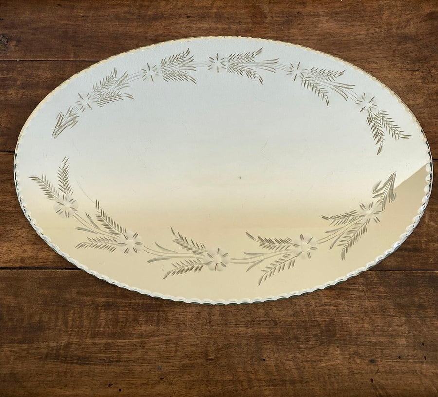 Beau miroir plateau art déco biseauté de forme ovale, orné de fleurs gravées dans la masse.