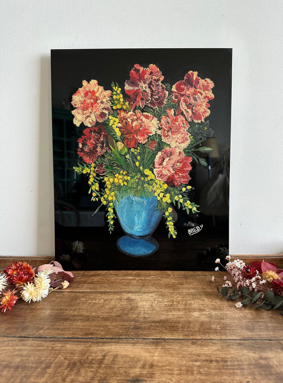 Peinture bouquet de fleurs signée sur plaque de céramique vitrée noire