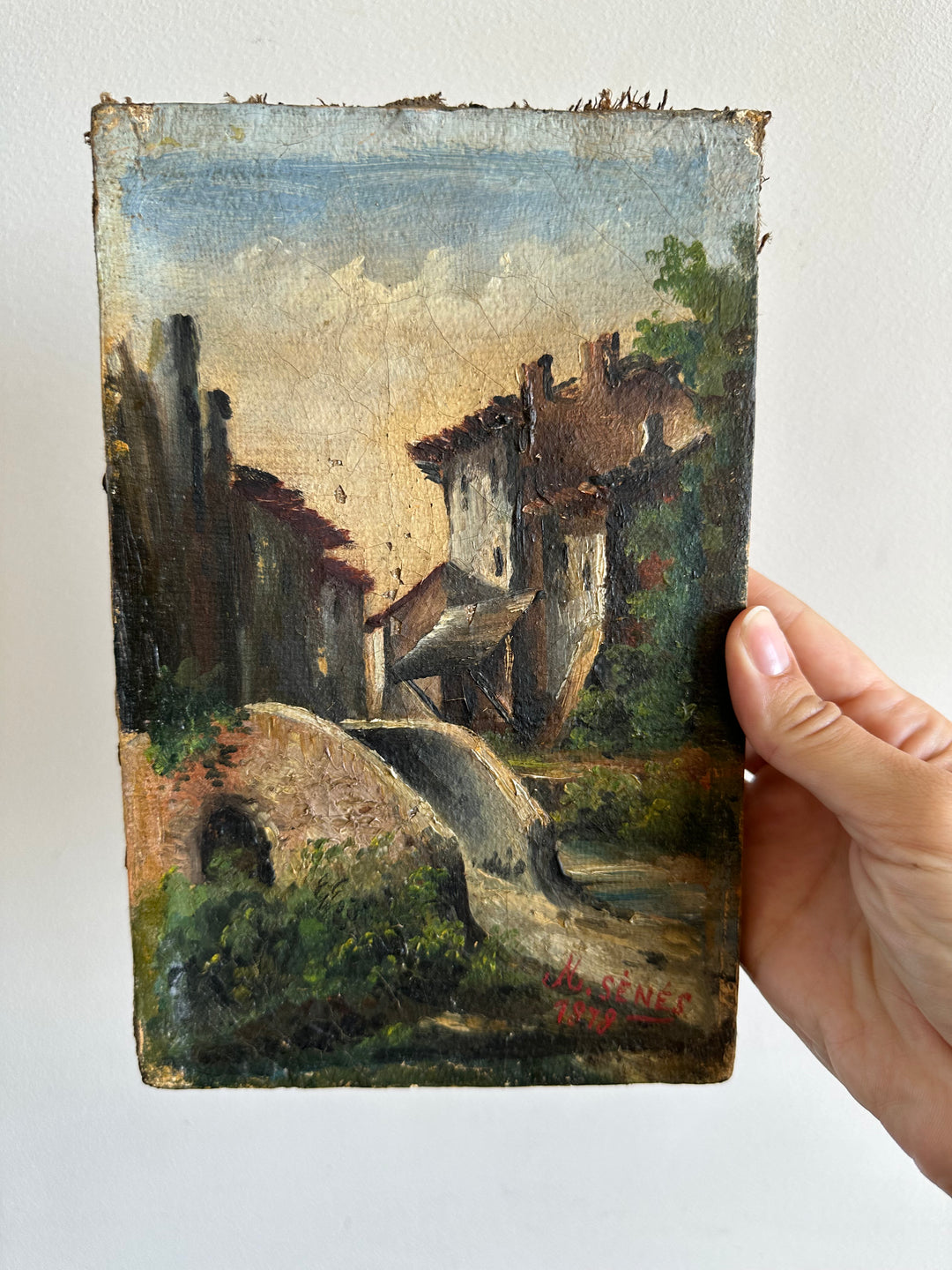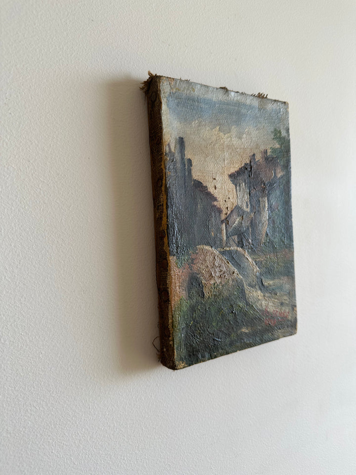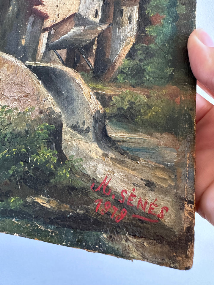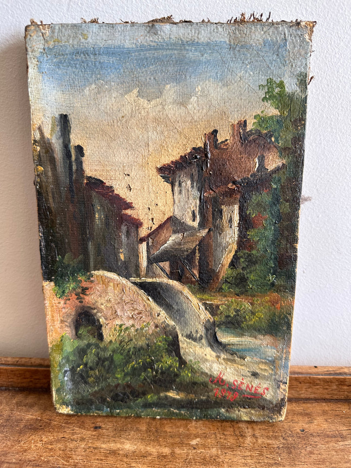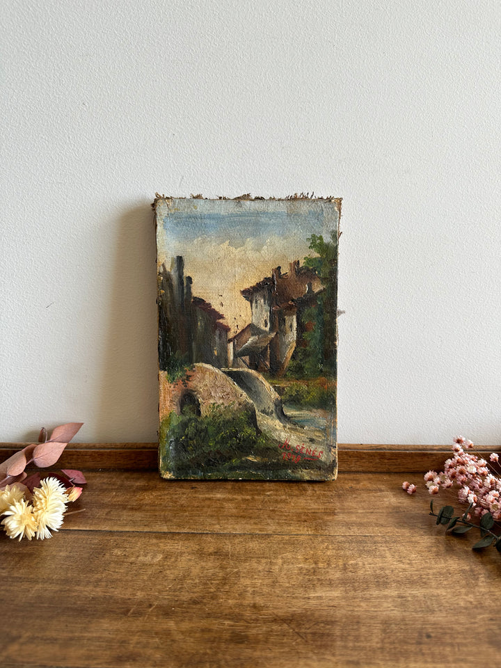 Charmante petite peinture sur toile signée, datant de 1878. Représentation d'un petit pont sur un ruisseau et d'un village de campagne.