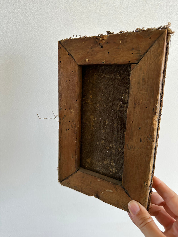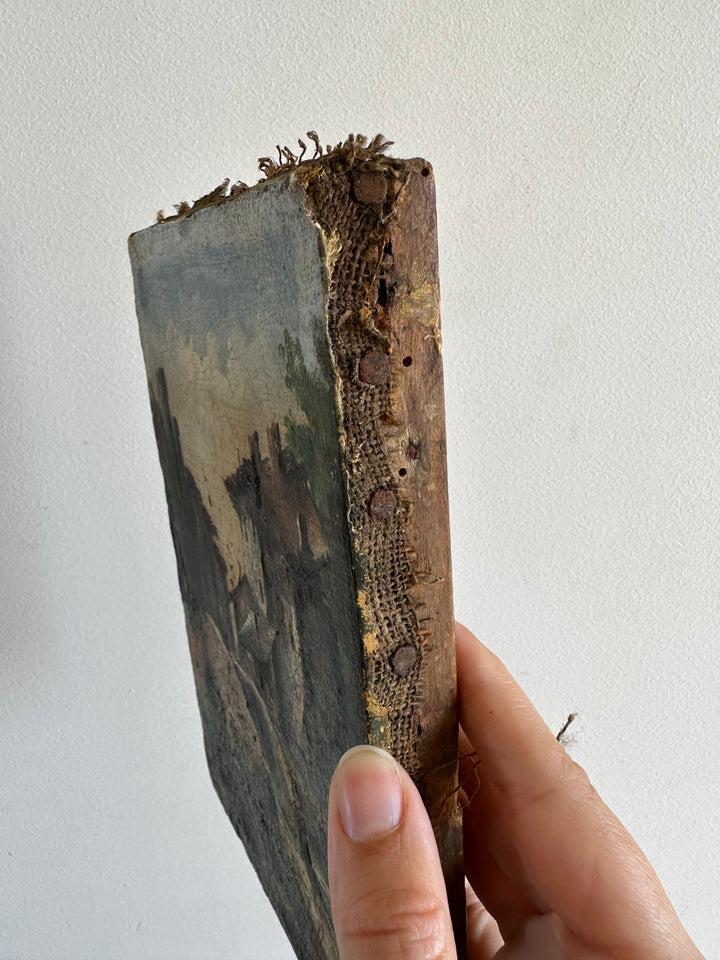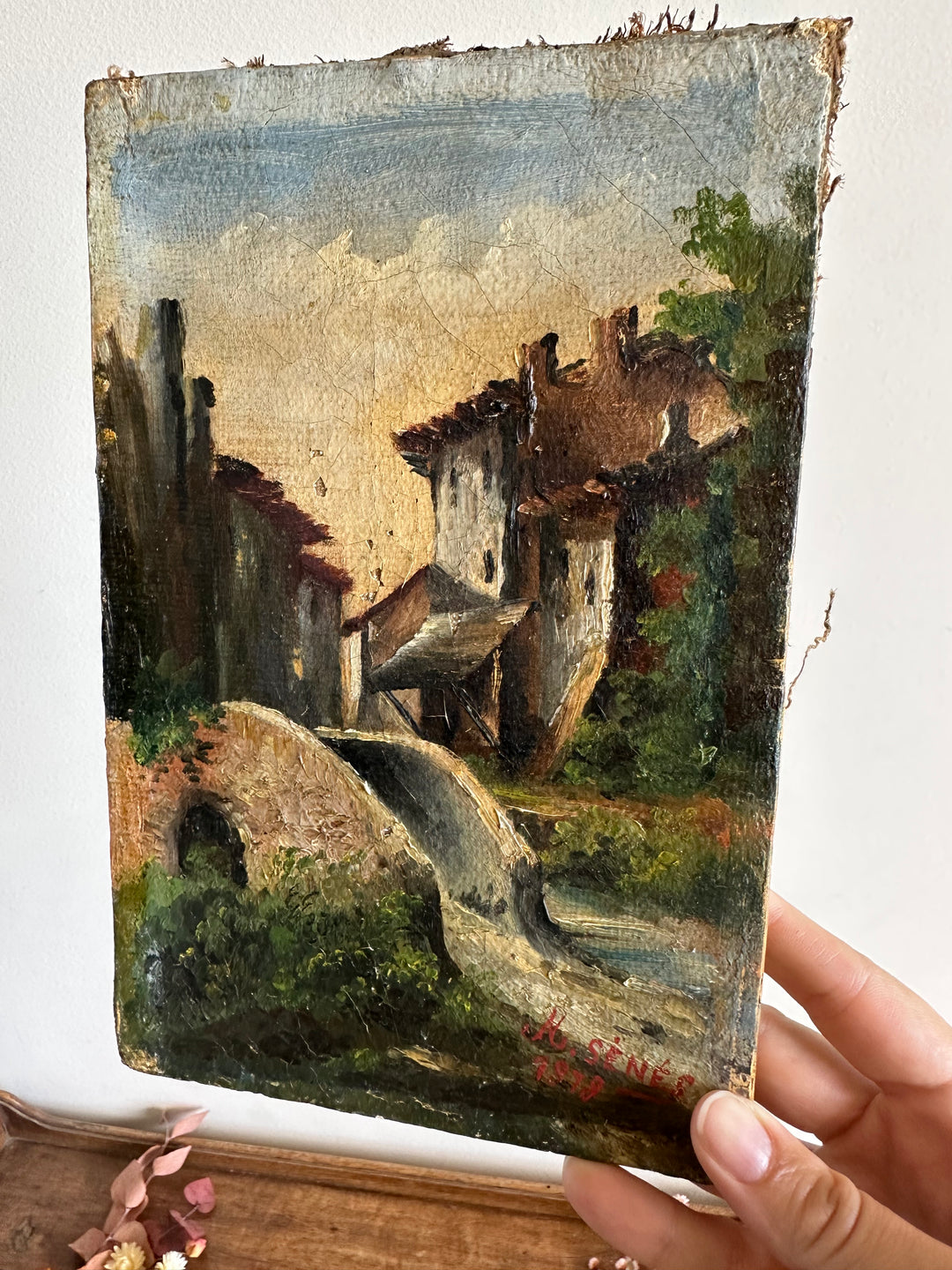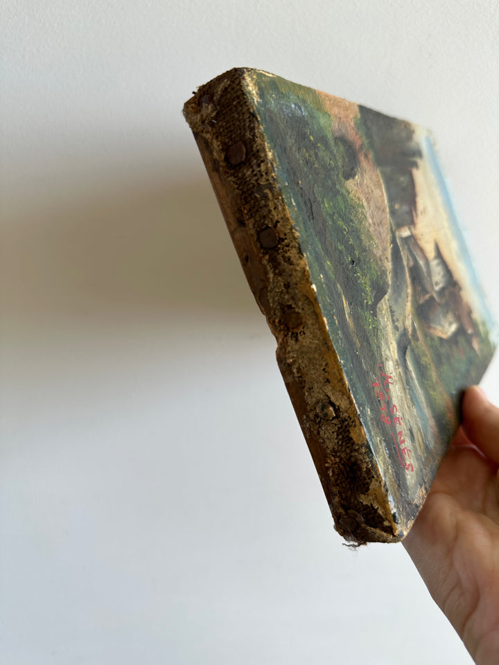 Charmante petite peinture sur toile signée, datant de 1878. Représentation d'un petit pont sur un ruisseau et d'un village de campagne.