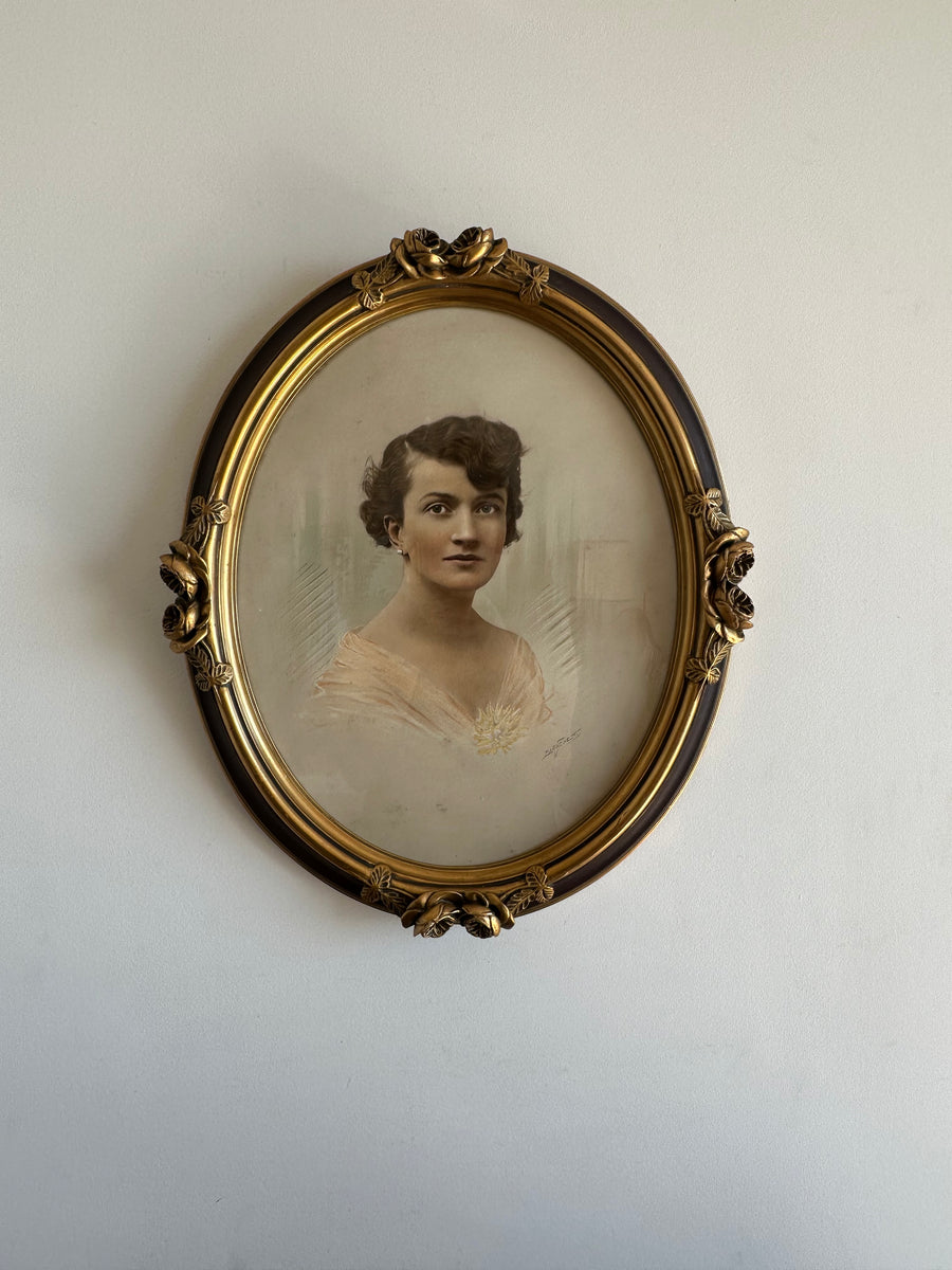 Superbe portrait d'une jolie jeune femme, rehaussé à la main. Très beau cadre en bois et stuc, orné de roses sculptées, présentant quelques signes du temps. On aime la beauté délicate de la jeune femme et sa toilette élégante. Estimation années 1900.