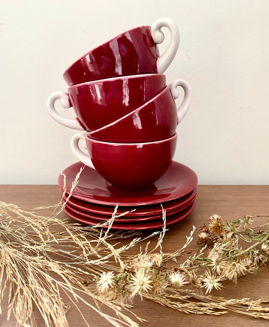 Lot de 4 tasses rétro bordeaux avec jolies poignées et soucoupes.