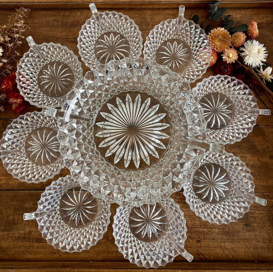 Grand récipient à salade de fruits vintage en verre taillé et ses 10 petites tasses assorties.