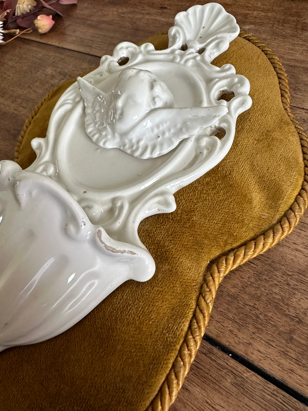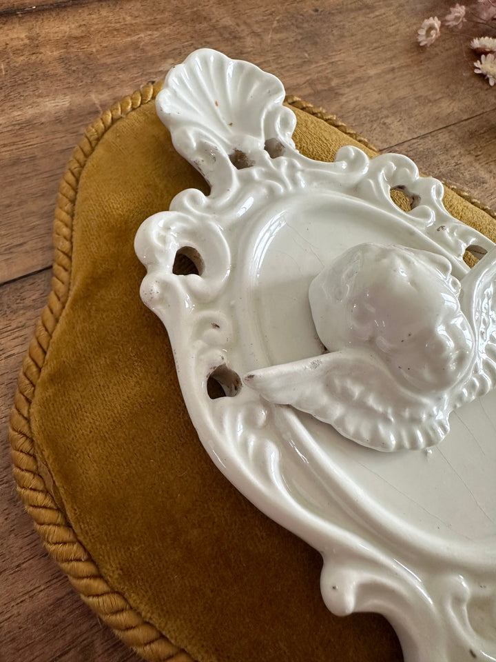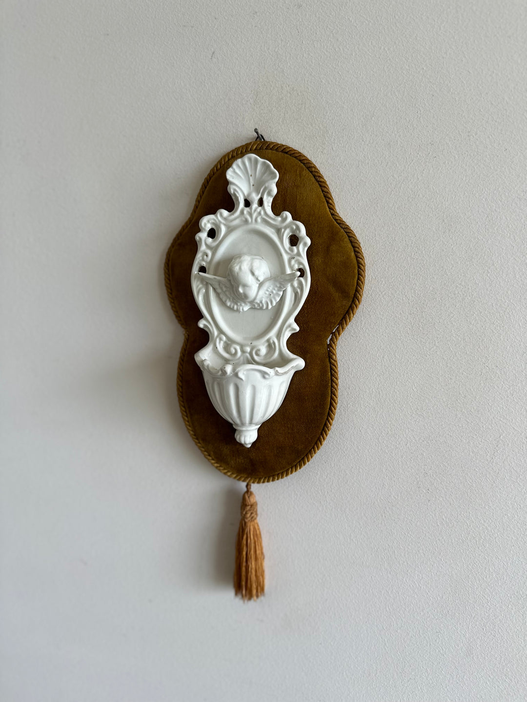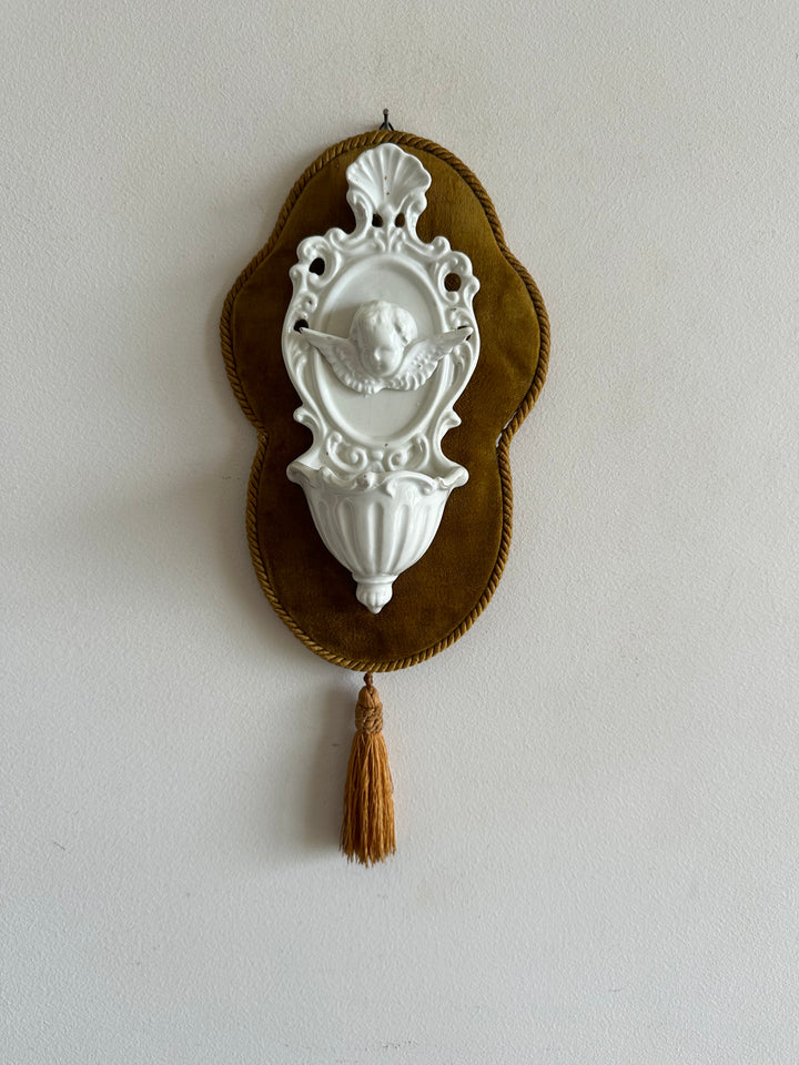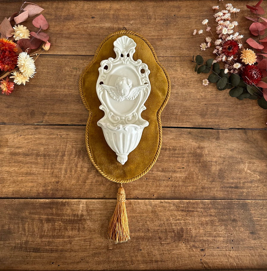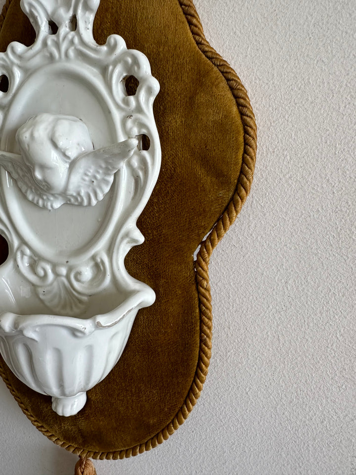 Charmant petit bénitier en porcelaine émaillée décorée d'un angelot. Support en velours couleur moutarde décoré d'un pompon. Estimation années 60.