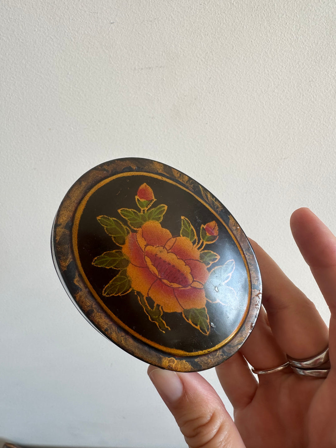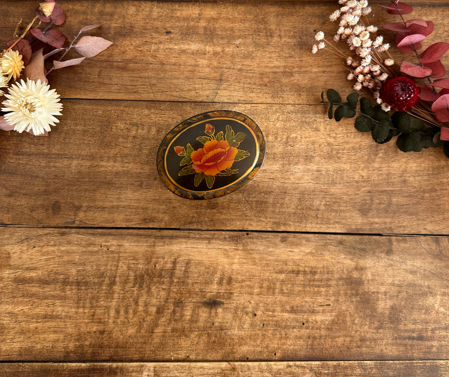 Jolie petite boite à bijoux en plastique décoré de motifs fleuris. Estimation années 70-80.