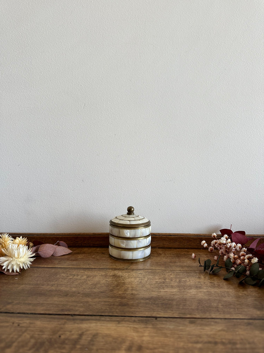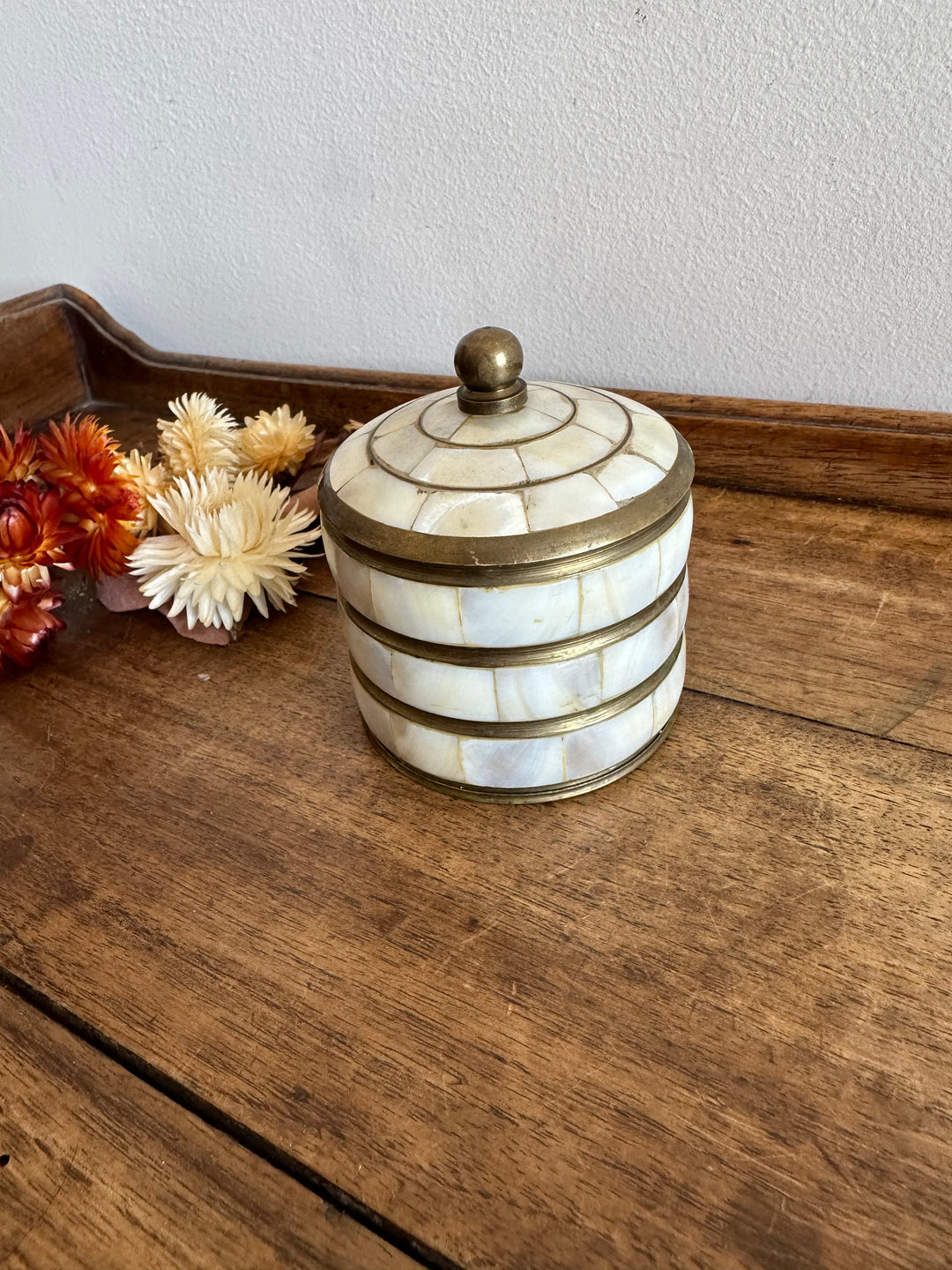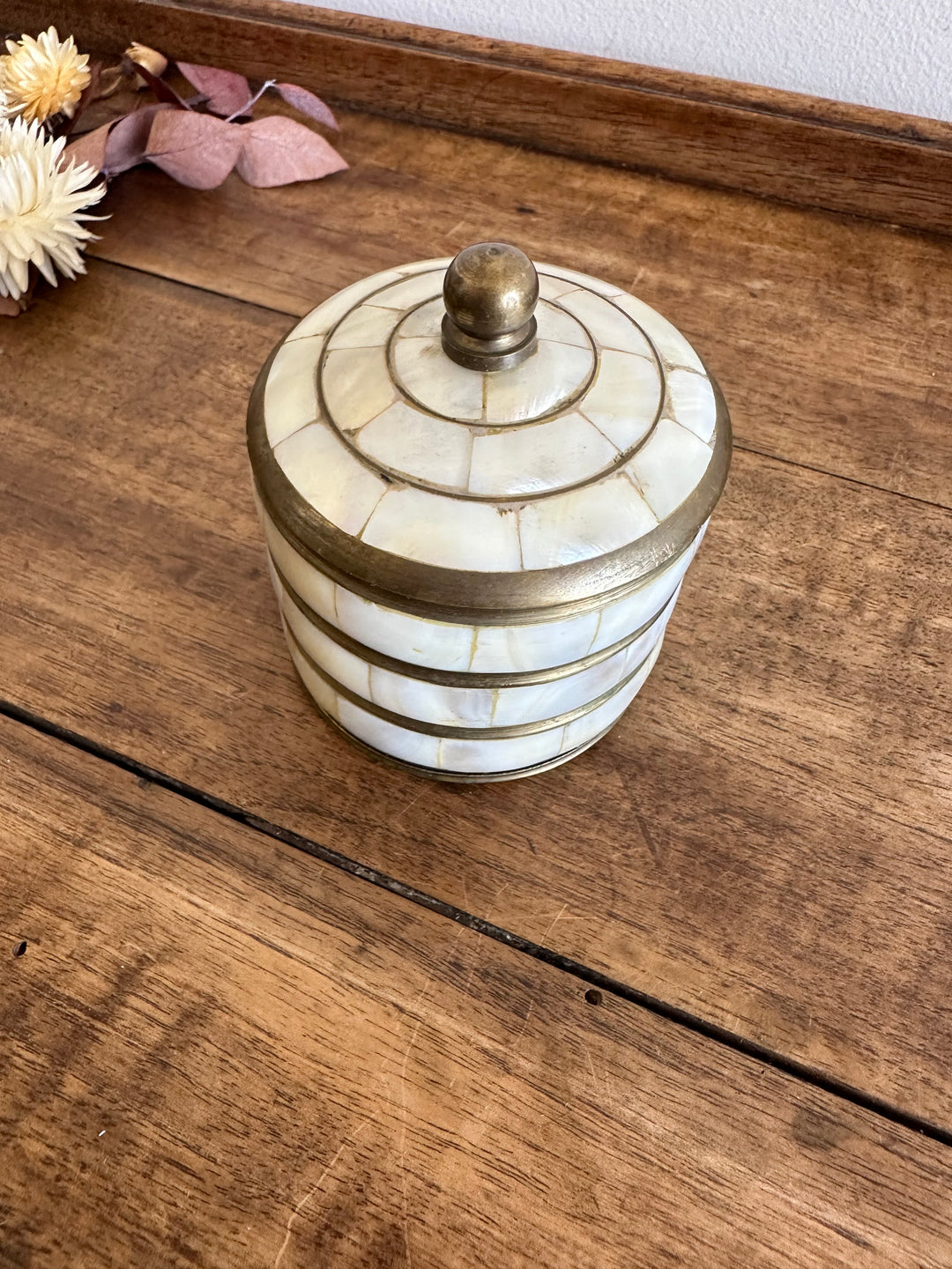 Belle petite boite à bijoux en laiton décorée d'une multitude de petites facettes nacrées. Estimation années 70. Objet ancien présentant une jolie patine.