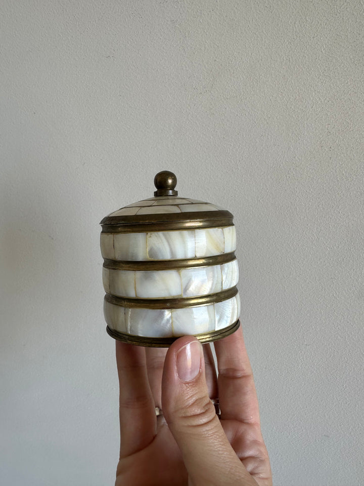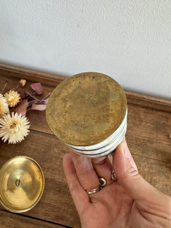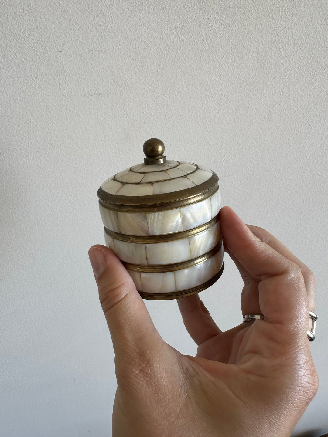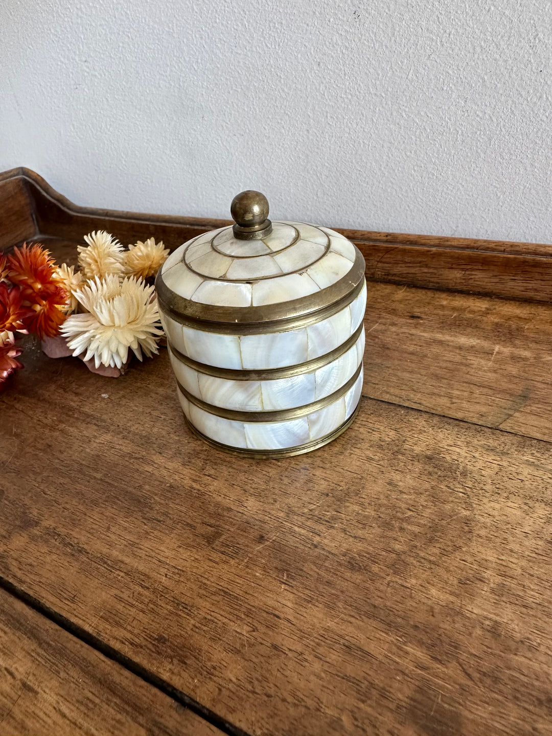 Belle petite boite à bijoux en laiton décorée d'une multitude de petites facettes nacrées. Estimation années 70. Objet ancien présentant une jolie patine.