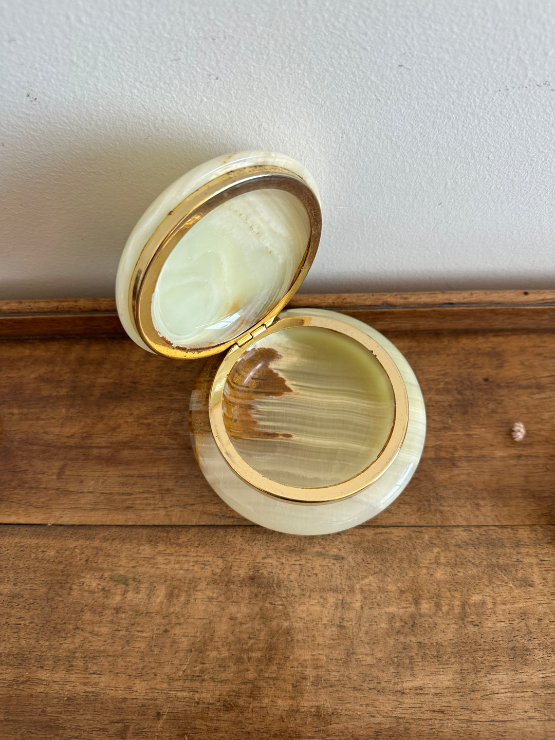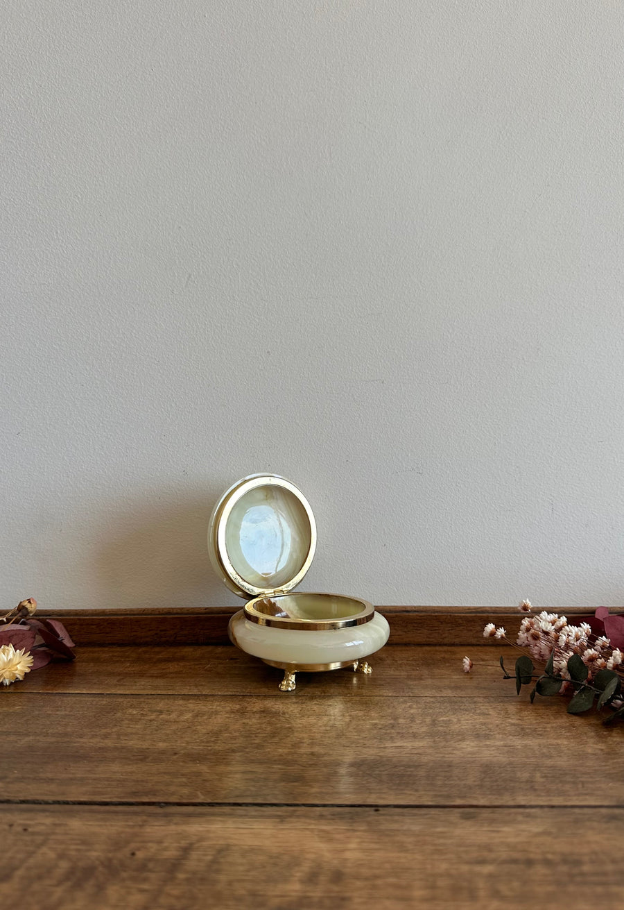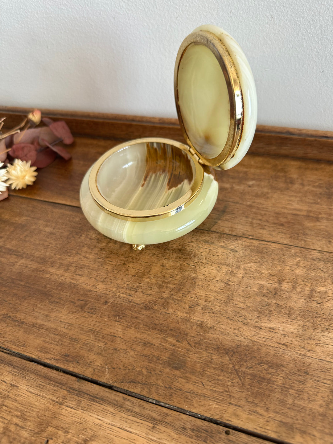 Adorable petite boîte ronde sur pieds dorés. Cerclée de métal doré. Estimation années 60. Objet dans son jus comme on les aime avec de jolies traces du temps.