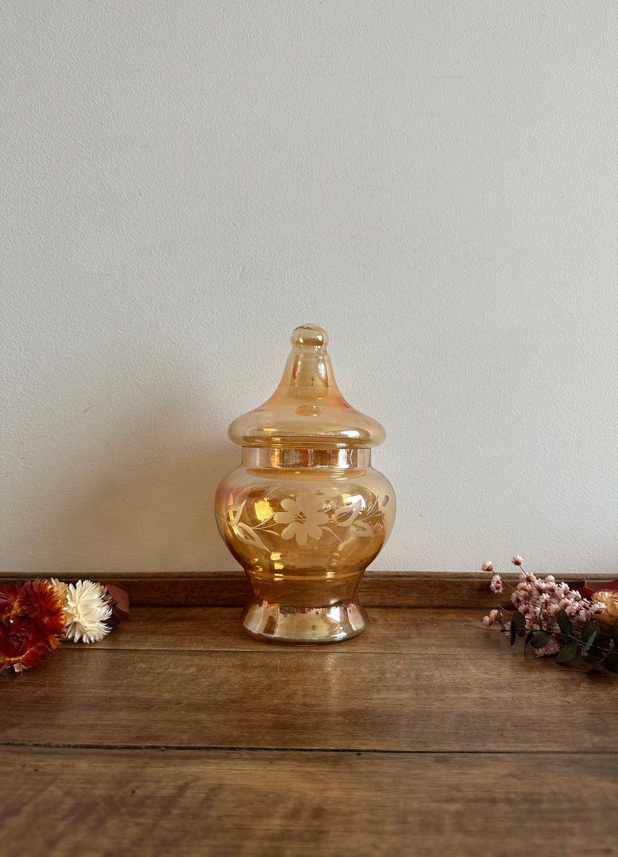 Jolie bonbonière en verre gravé. On aime ses tons oranges irisés. De très légères traces du temps que nous avons tenté de montrer sur les photos. Estimation années 50.