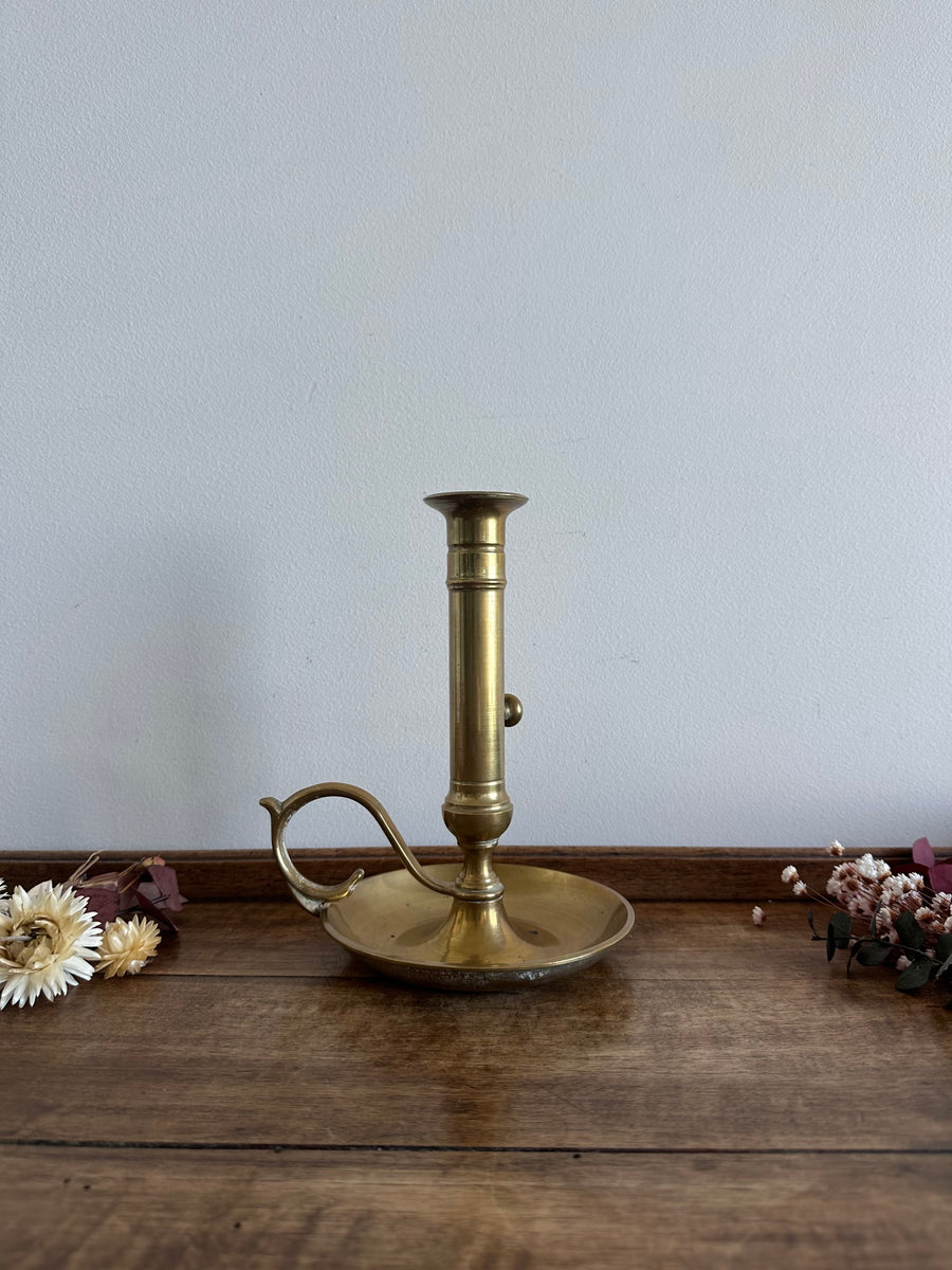 Jolie bougeoir à poussoir en laiton doré. Estimation années 70.