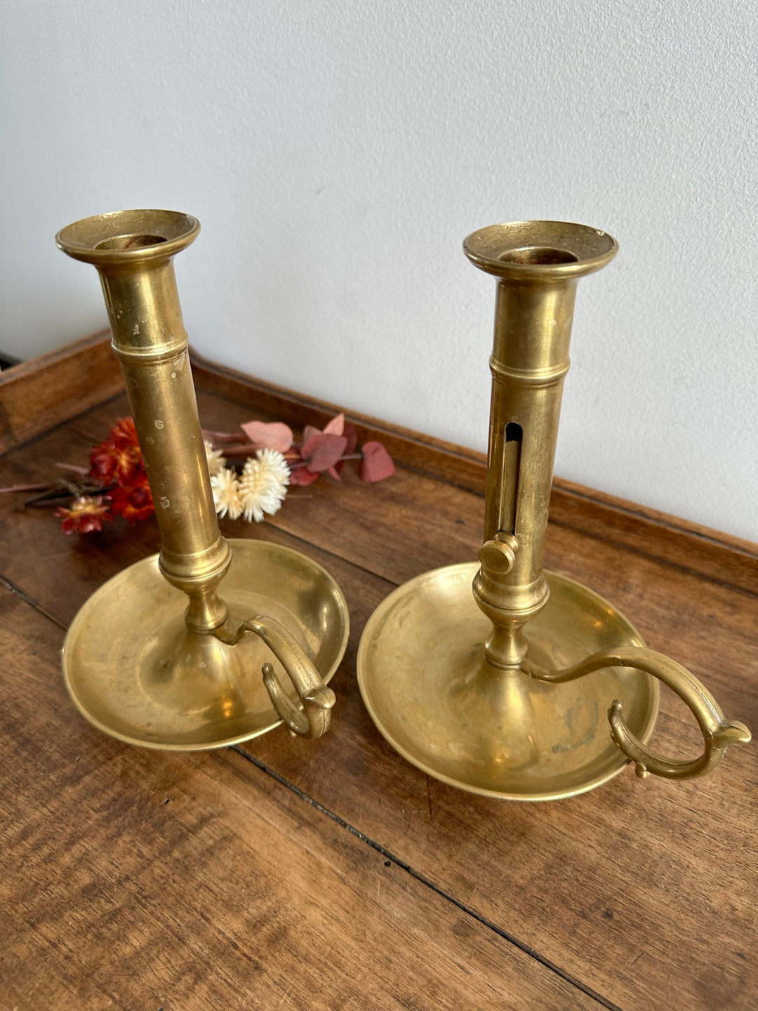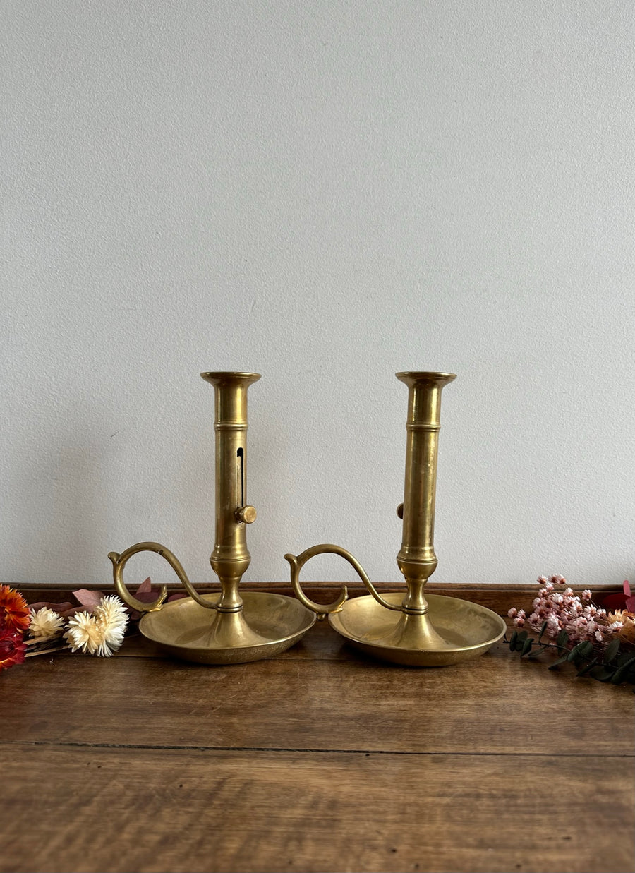 Joli duo de bougeoirs en laiton à poussoir. Vendus séparément.