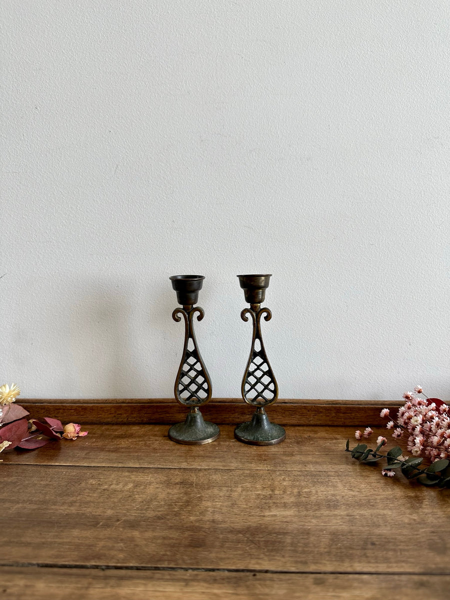 Joli duo de petits bougeoirs en alliage de métaux. Probablement régule et bronze. Complètement imparfaits et si mignons. Vendus ensemble