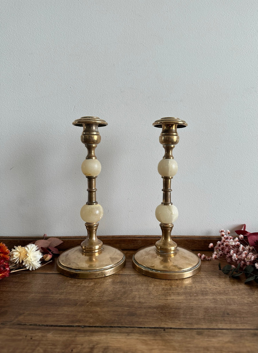 Superbe paire de bougeoirs en laiton cuivre et albâtre du XIX ème. Vendus séparément.