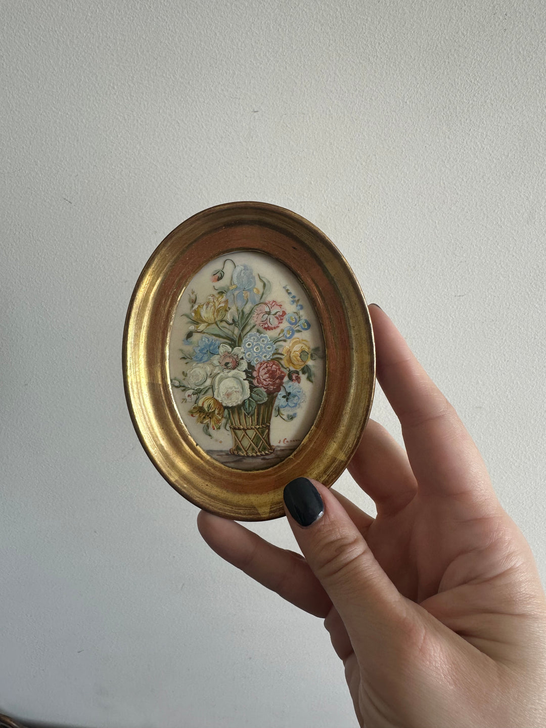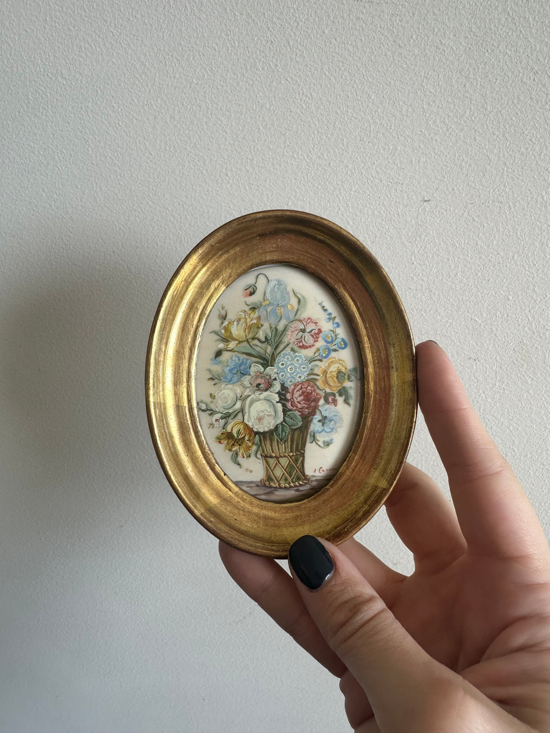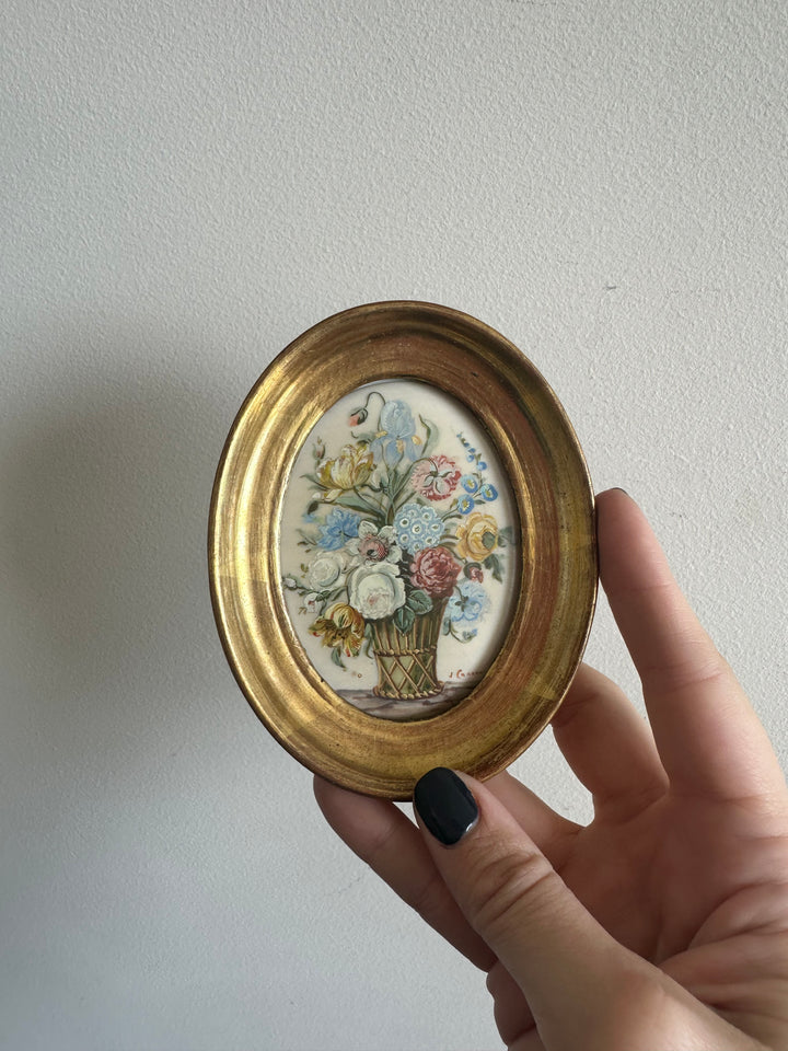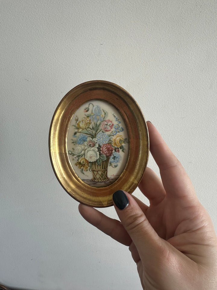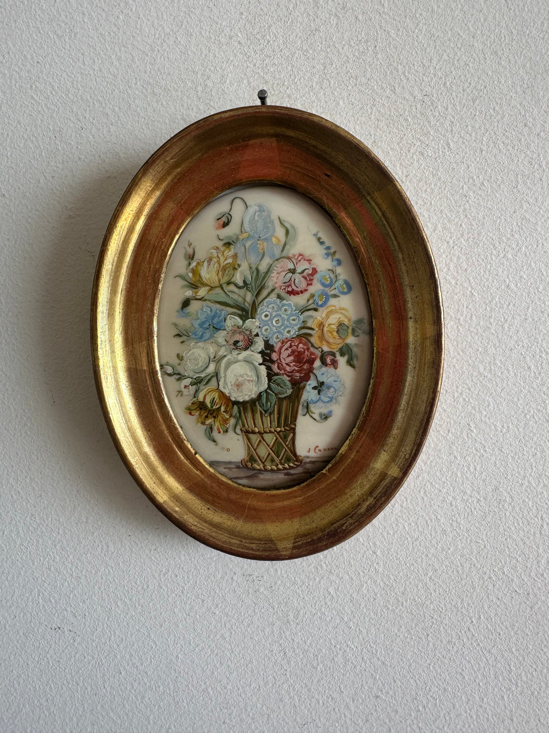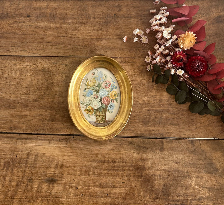 Bouquet de fleurs signé peint sur ivoire cadre ovale doré à la feuille d'or