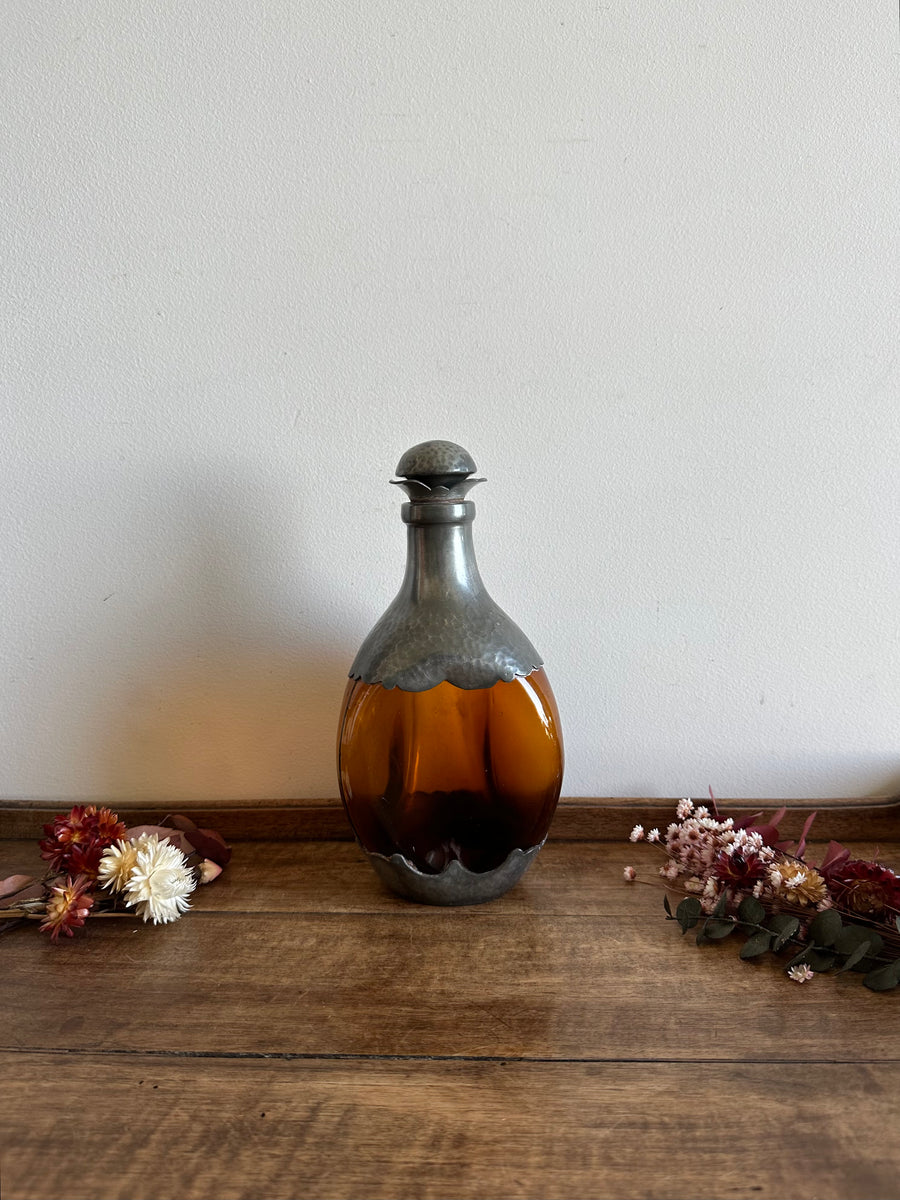 Jolie bouteille en verre ambrée décorée d'étain martelé.