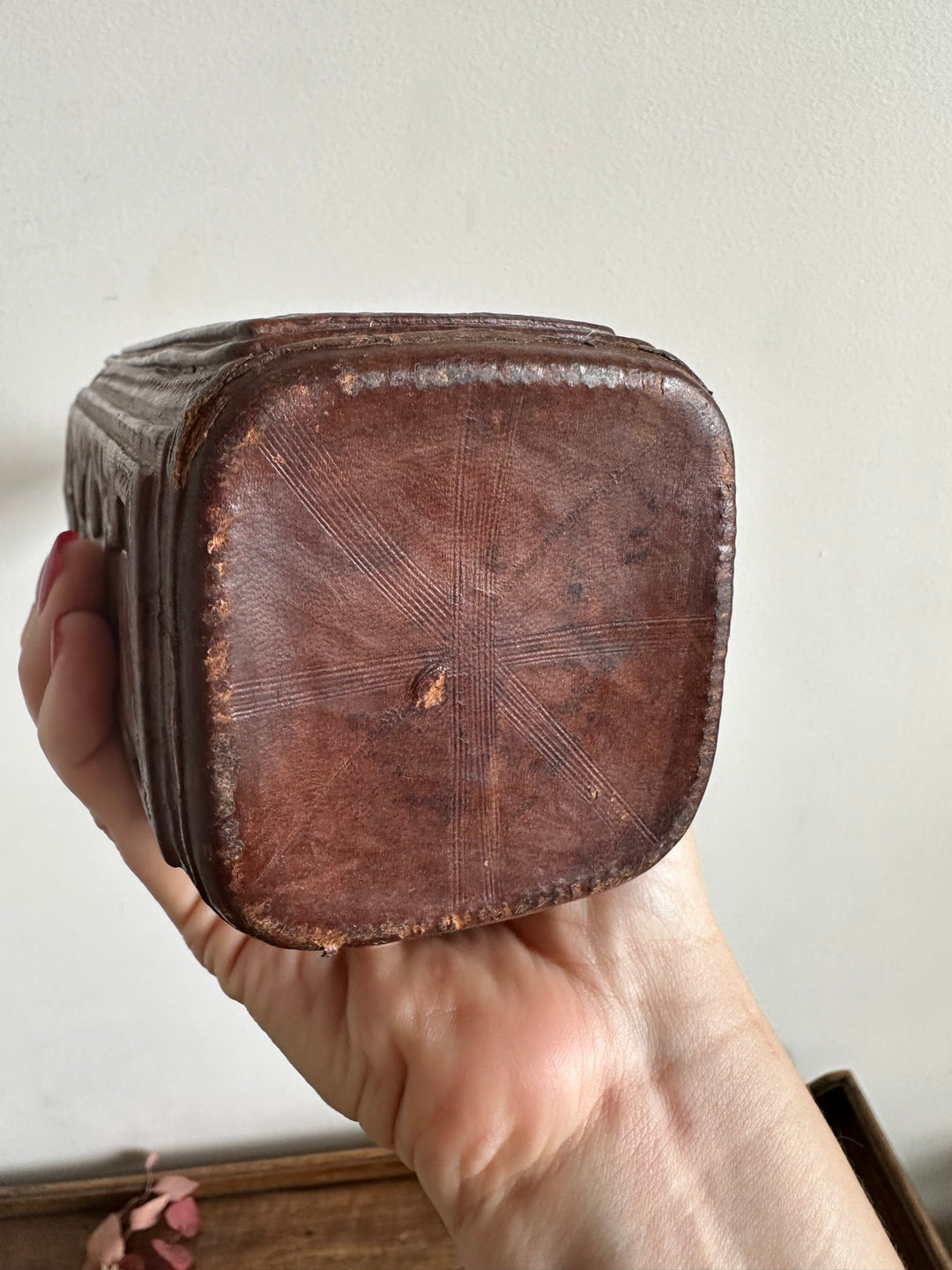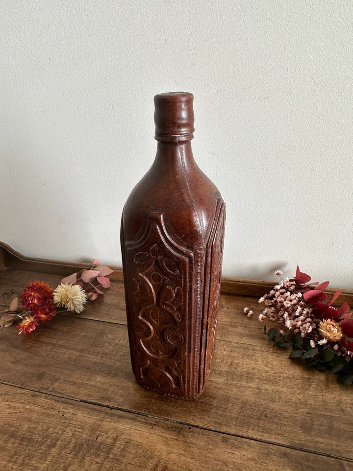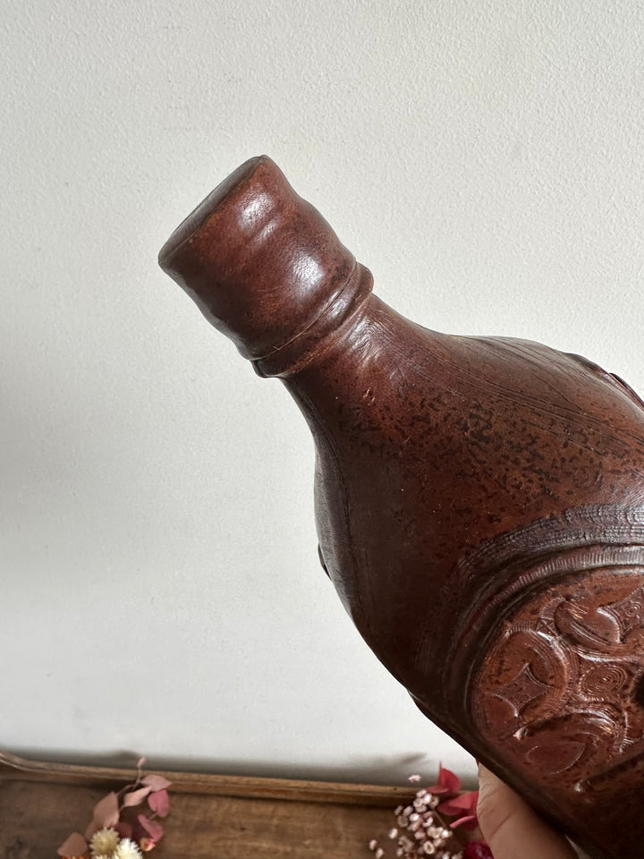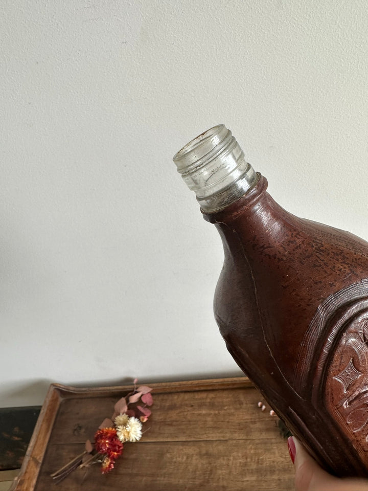 Ancienne bouteille en verre recouverte de cuire. Jolis motifs gravés. Estimation années 70.