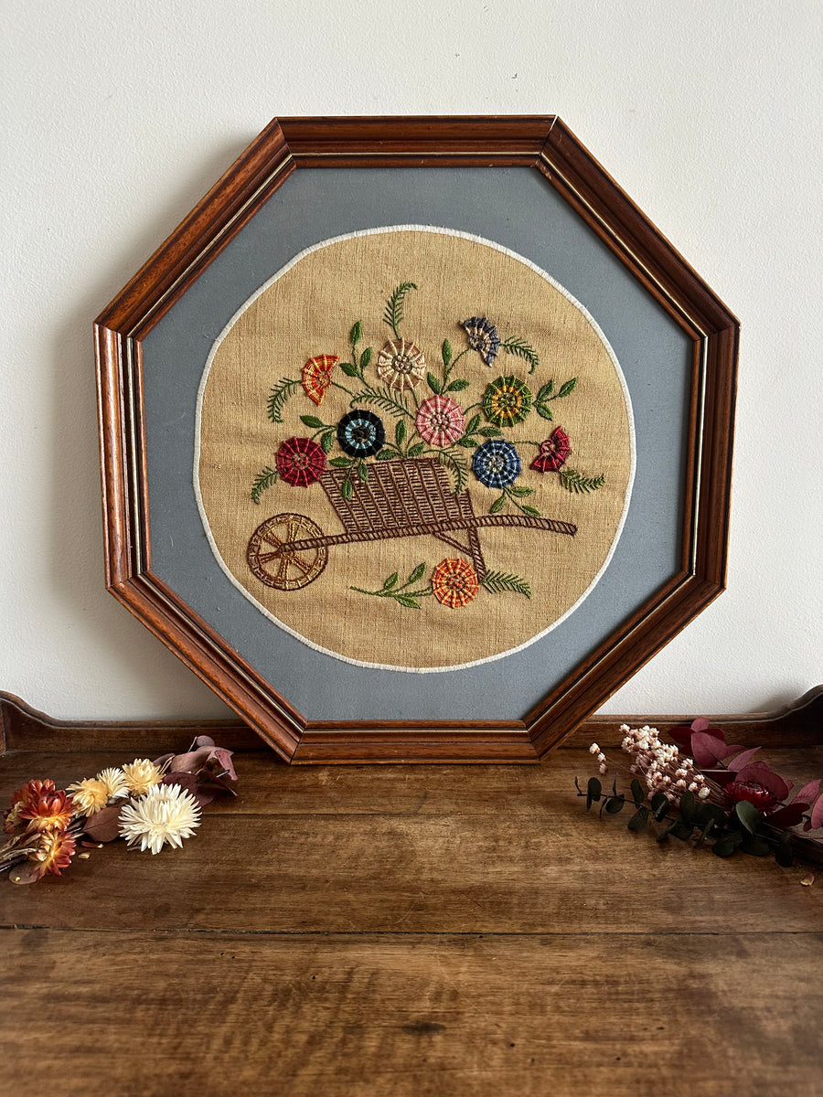 Belle broderie des années 50. Cadre en bois foncé octogonal. On aime la fraîcheur des motifs qui la composent.
